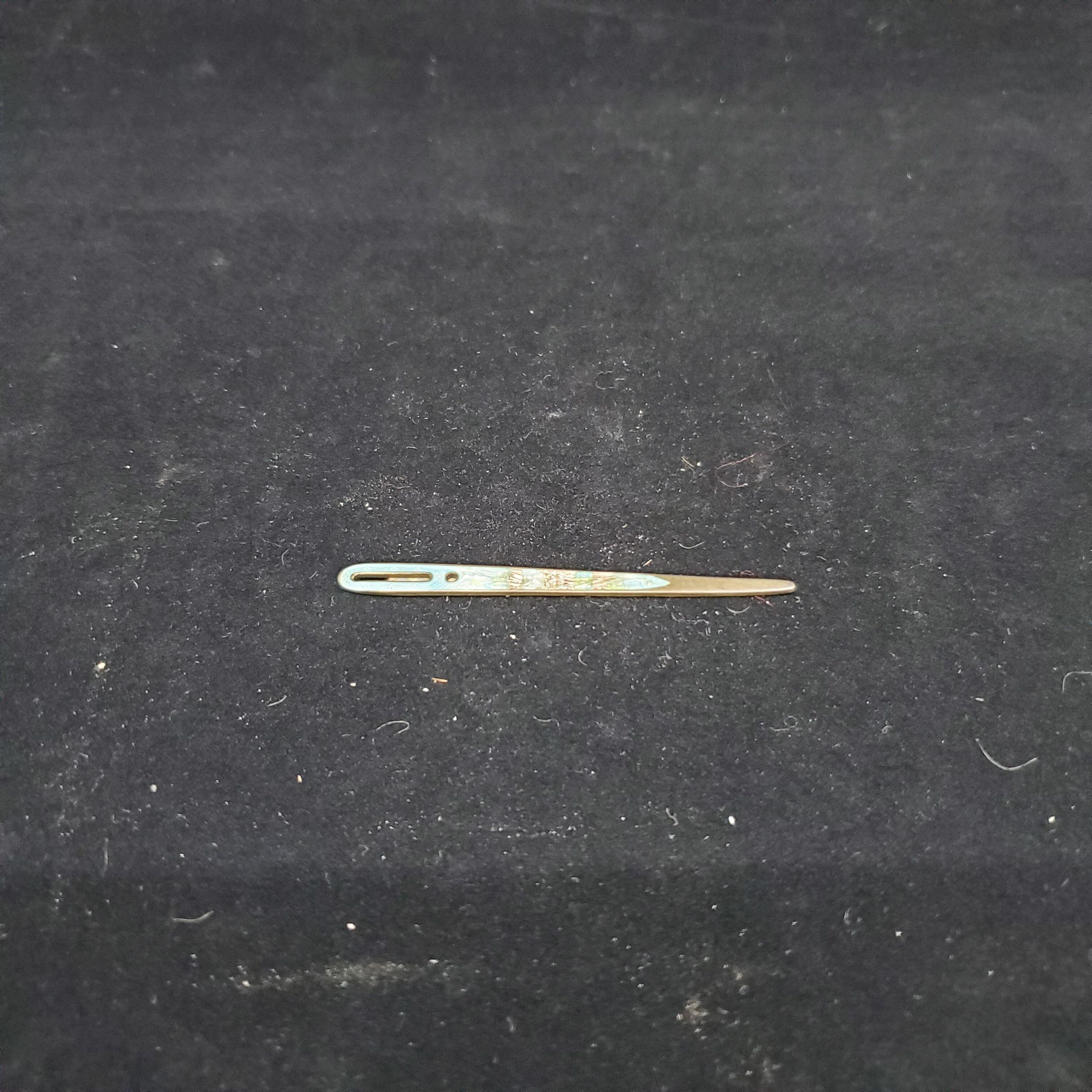 Enamelled bodkin with enamelling from top to within a thrd of lowest point .Two eyes - one small round one, one long one. Blue green and white enamelling on a metal bodkin. Metal is a brass colour but is stamped ÒBermuda SterlingÓ