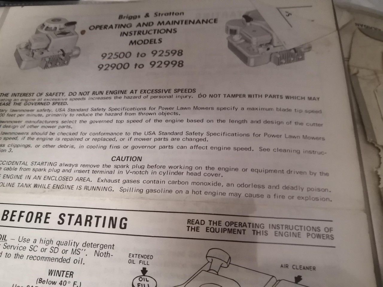 Briggs and Stratton operating and maintenance instructions models 92500 to 92598, 92900 to 92998