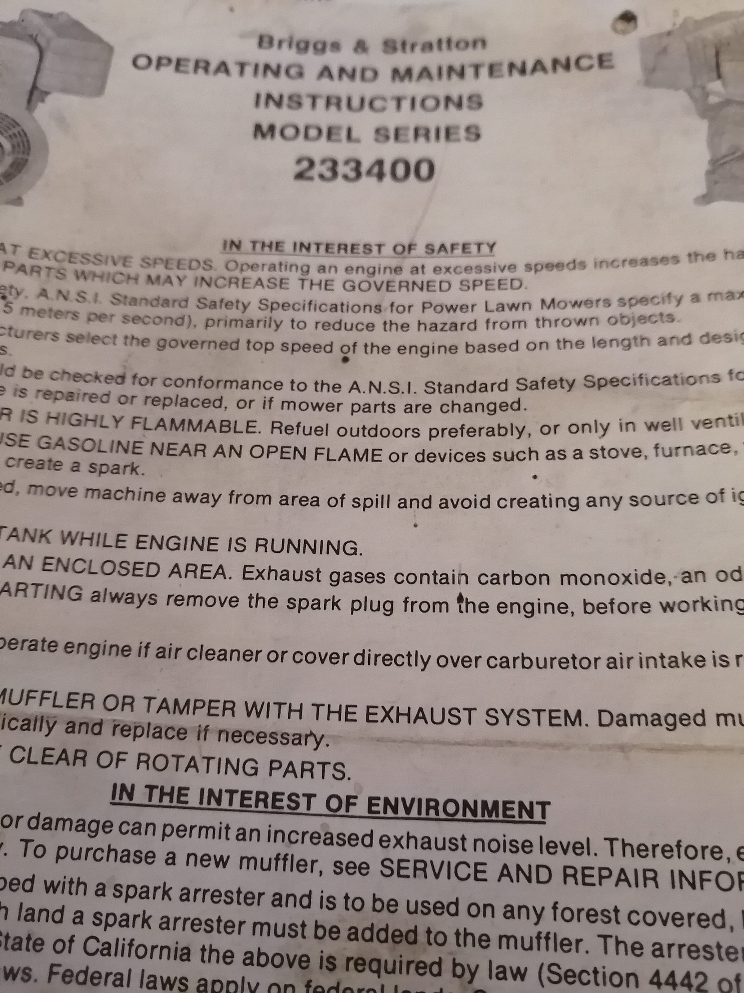 Briggs and Stratton. Operating and maintenance instructions model series 233400