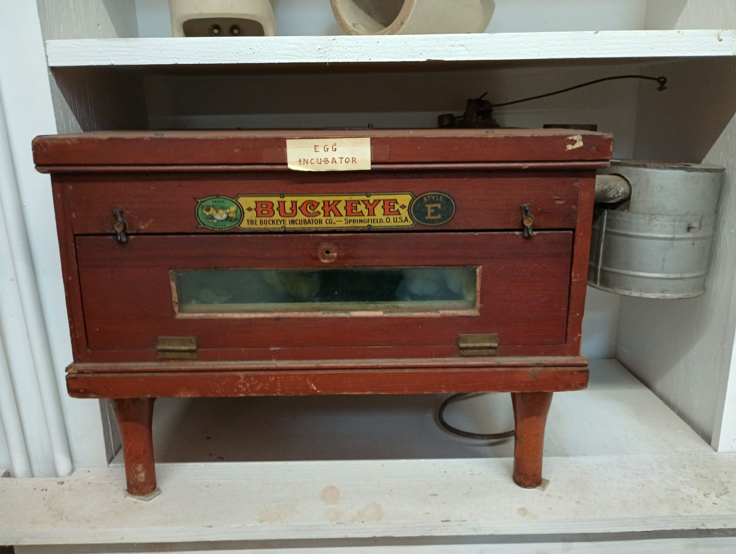 Wooden table top cabinet egg incubator heated by kerosene. Manufactured by the Buckeye Incubator Company, Springfield Ohio.