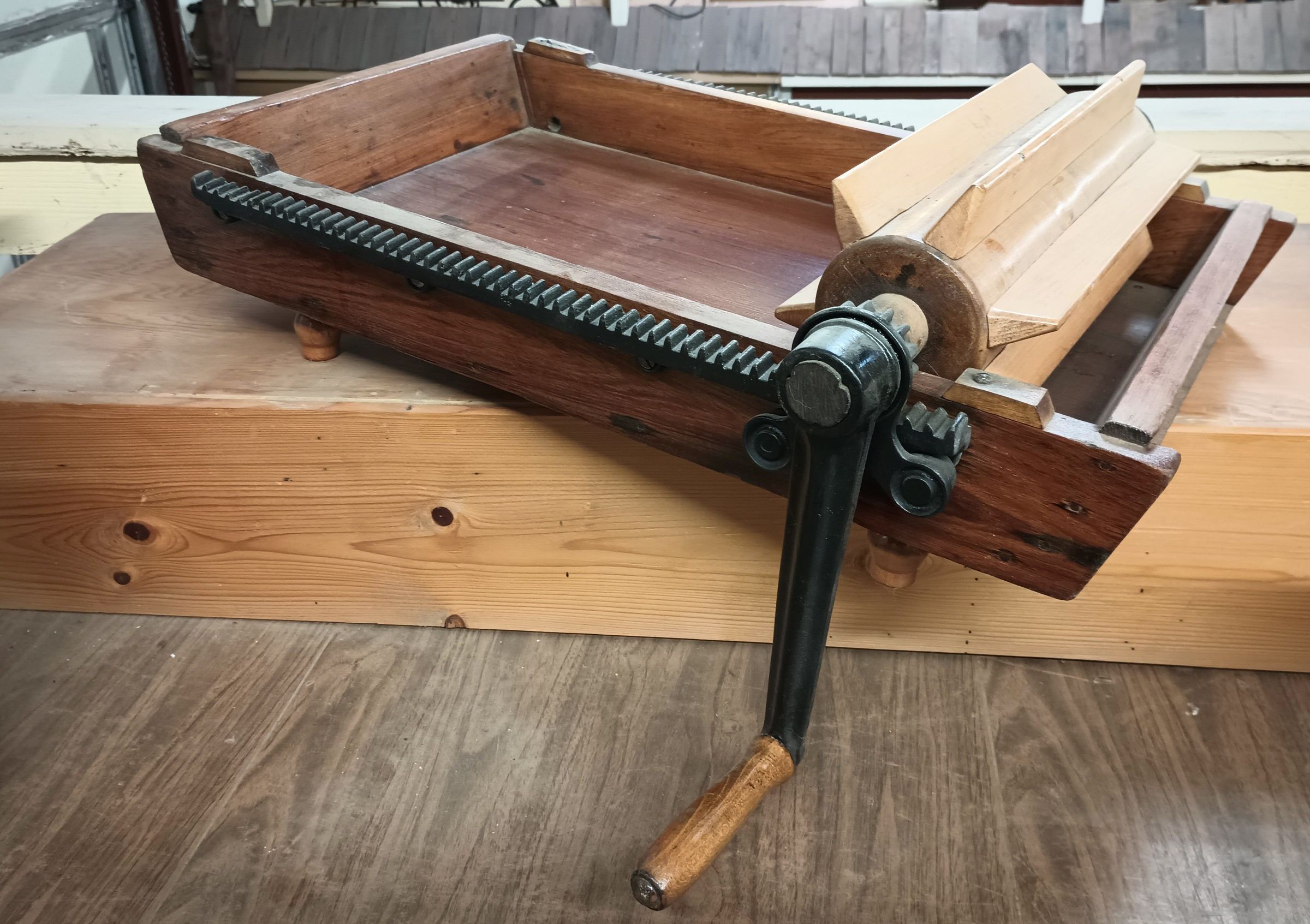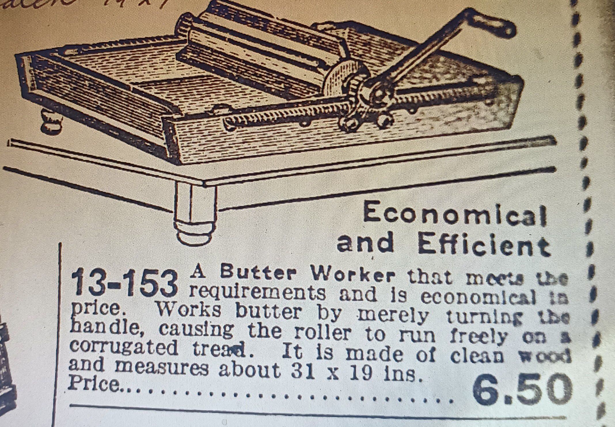 Used to roll partly finished butter, working in salt and pressing out any remaining buttermilk. The tray is tilted by two small feet on the side, so that the buttermilk flows through a hole in the back.