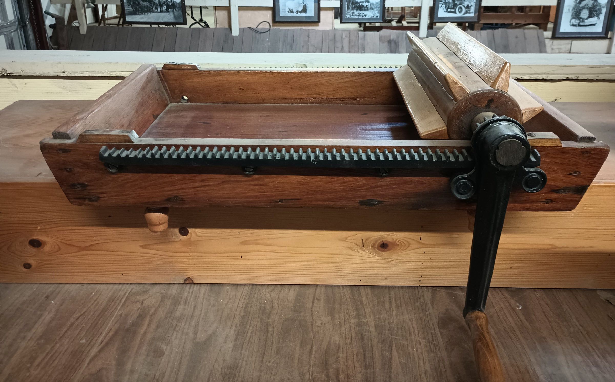 Table top wooden butter worker with two small feet, cast iron handle and track and lobed wooden roller. Manufactured by A.H. Reid. Patented 1875.