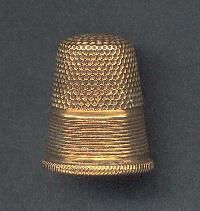 Brass thimble with diagonally ribbed rim. Wide band of horizontal infented lines above. No marks