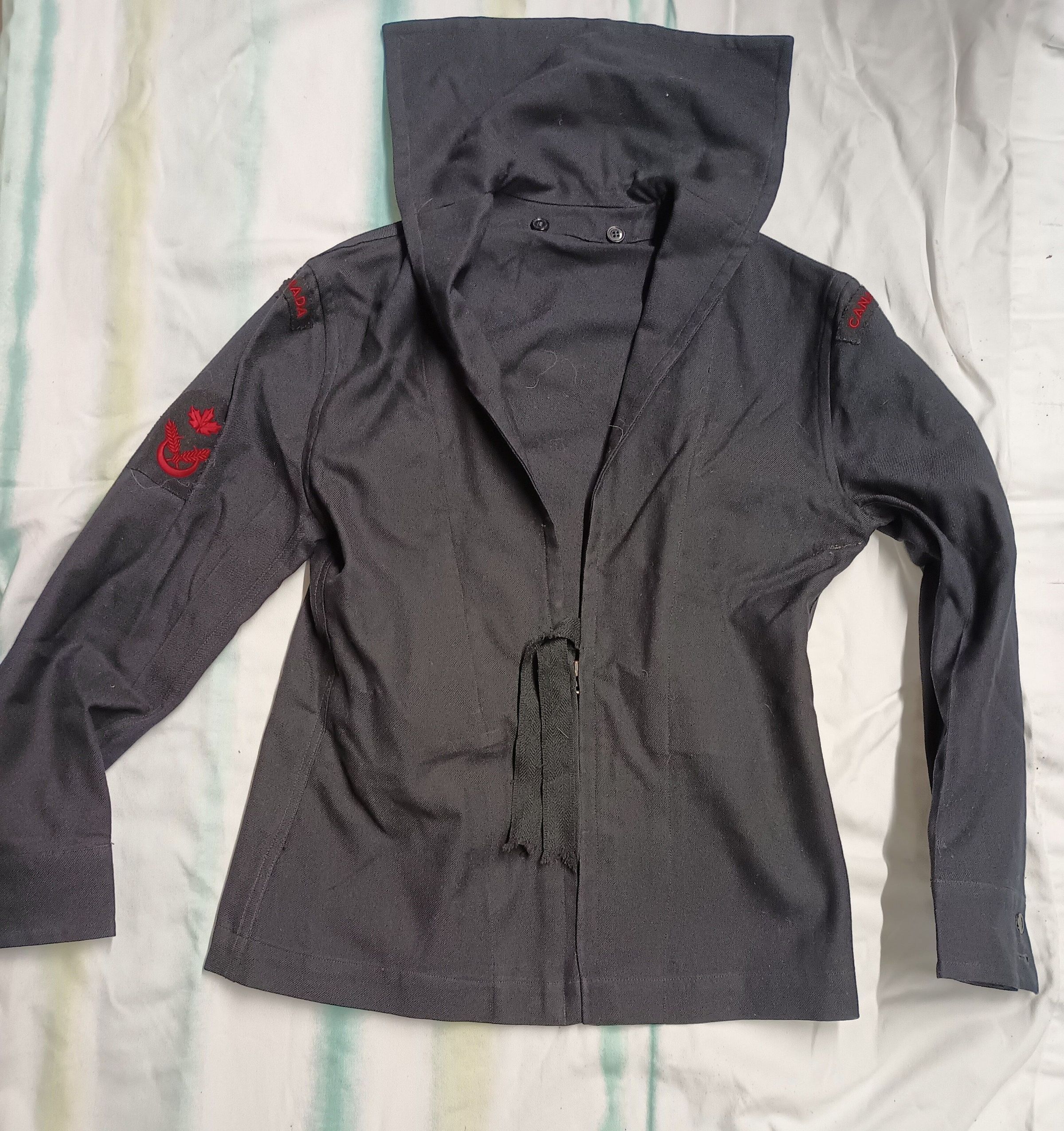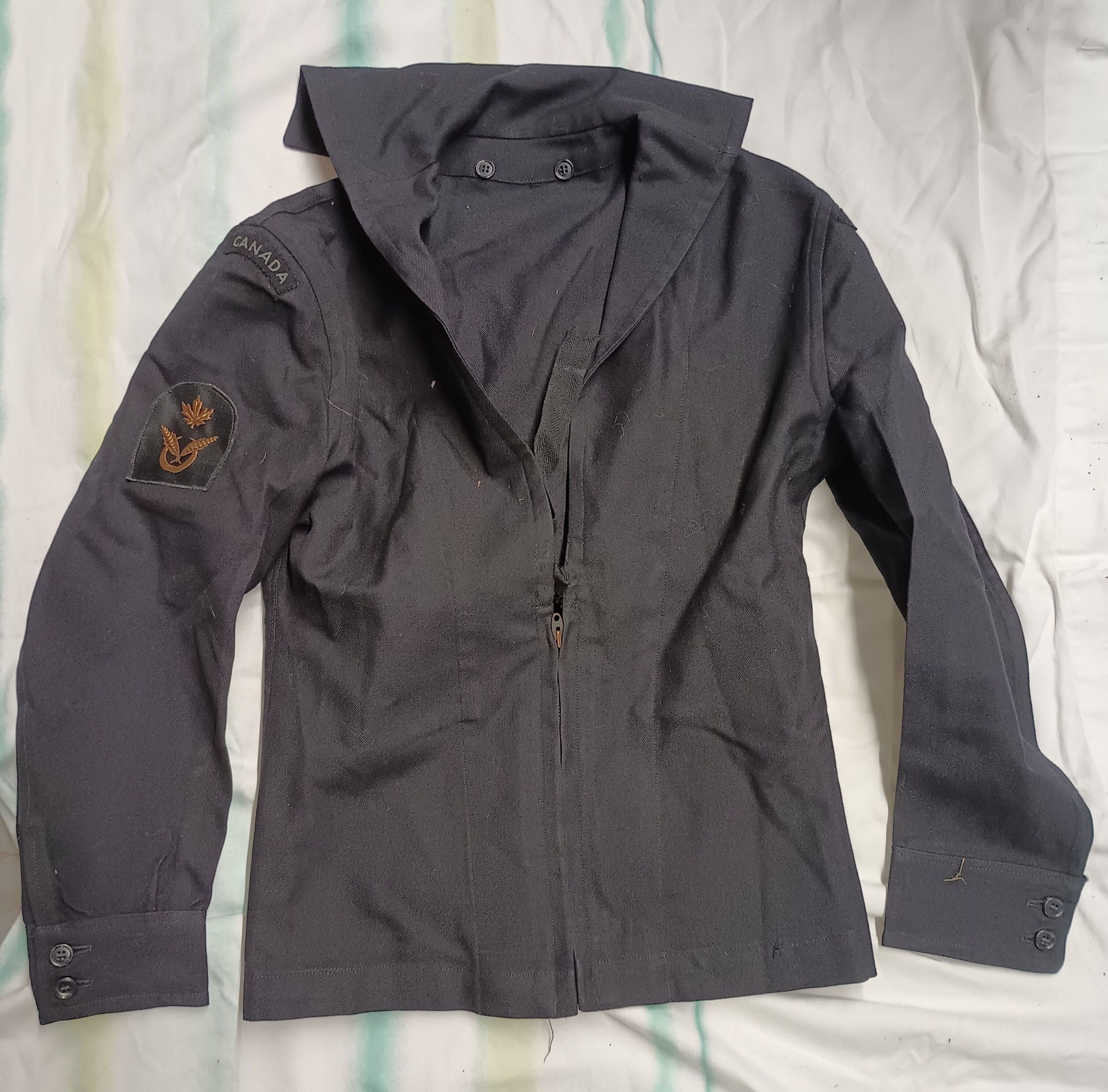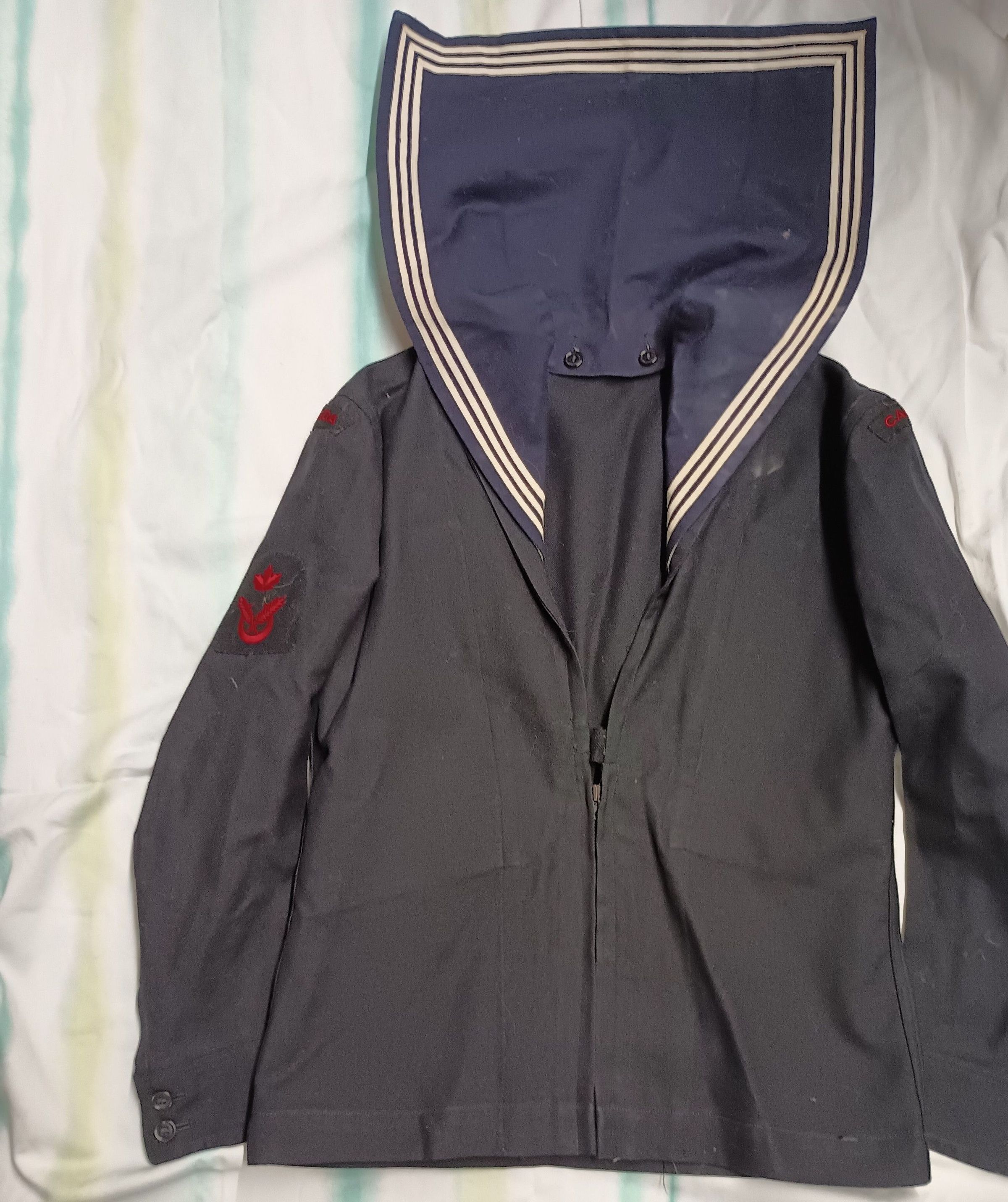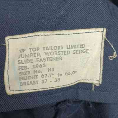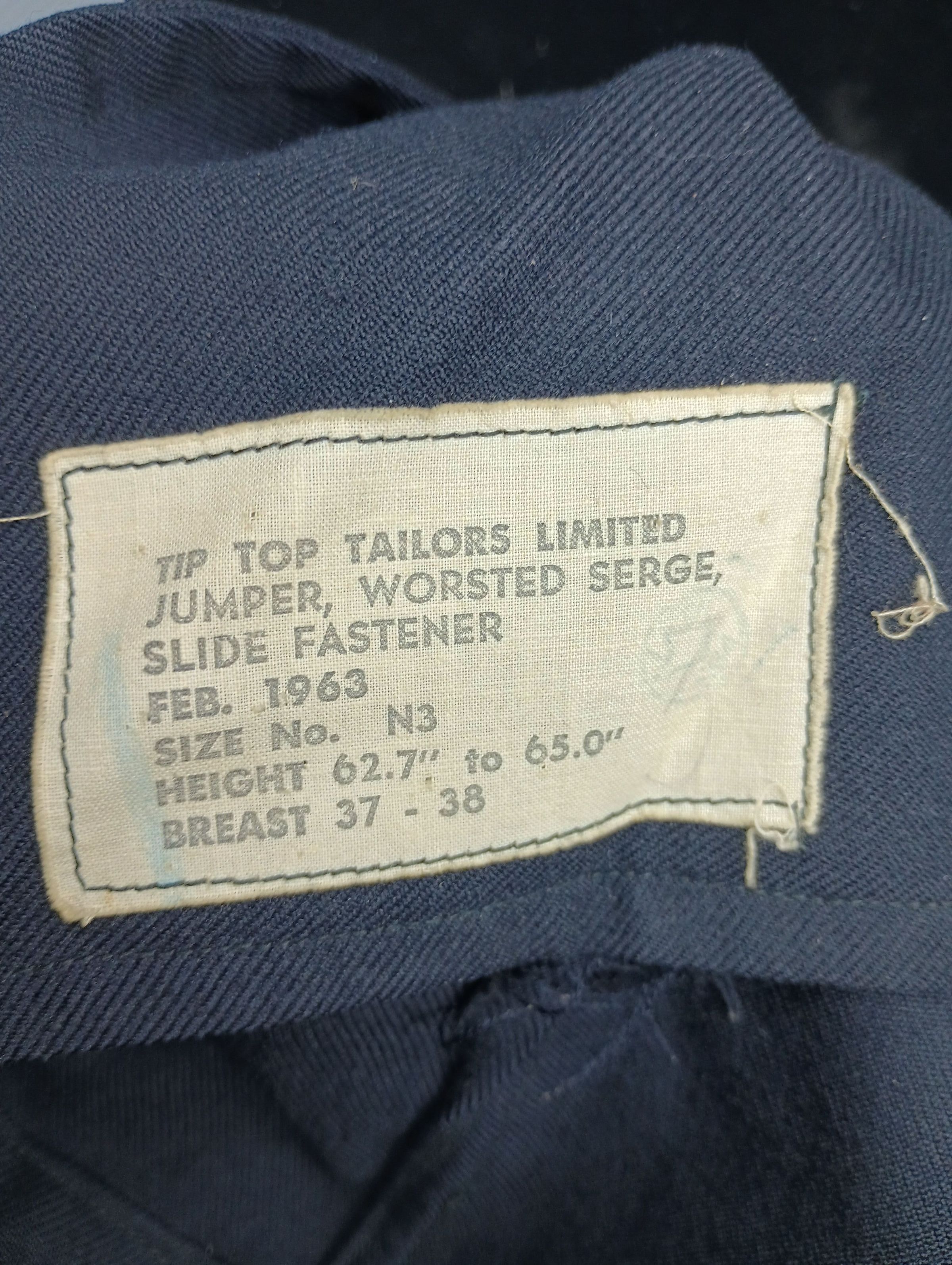 3 Canadian Navy dark blue zippered jackets of worsted serge (wool) , sewn by Tip Top Tailors in 1963. They were owned by a cook as indicated by the insignia.Context