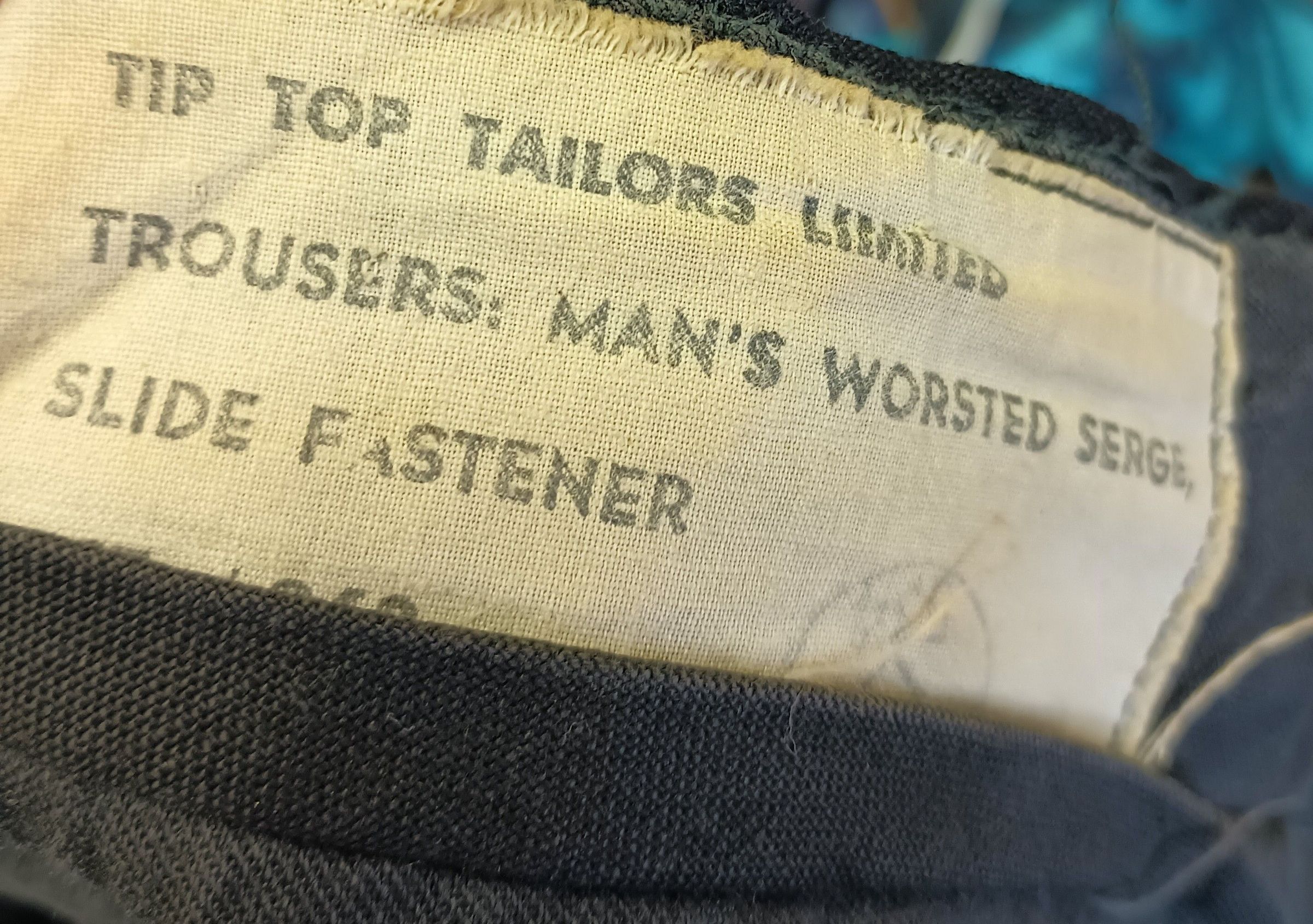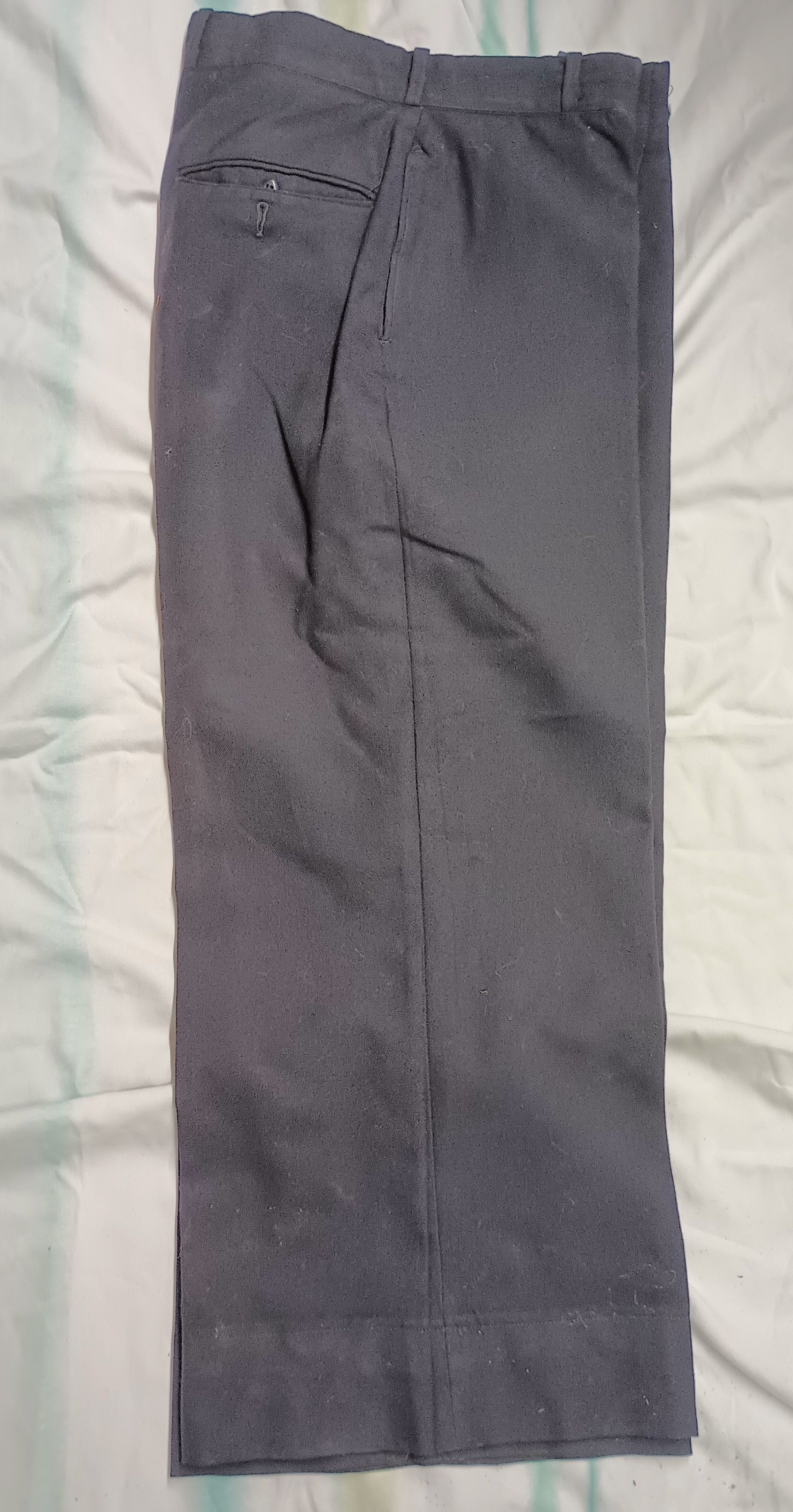 Canadian Navy Uniform wide bottom pants of dark blue worsted serge (wool) sewn by Tip Top Tailors in 1963.