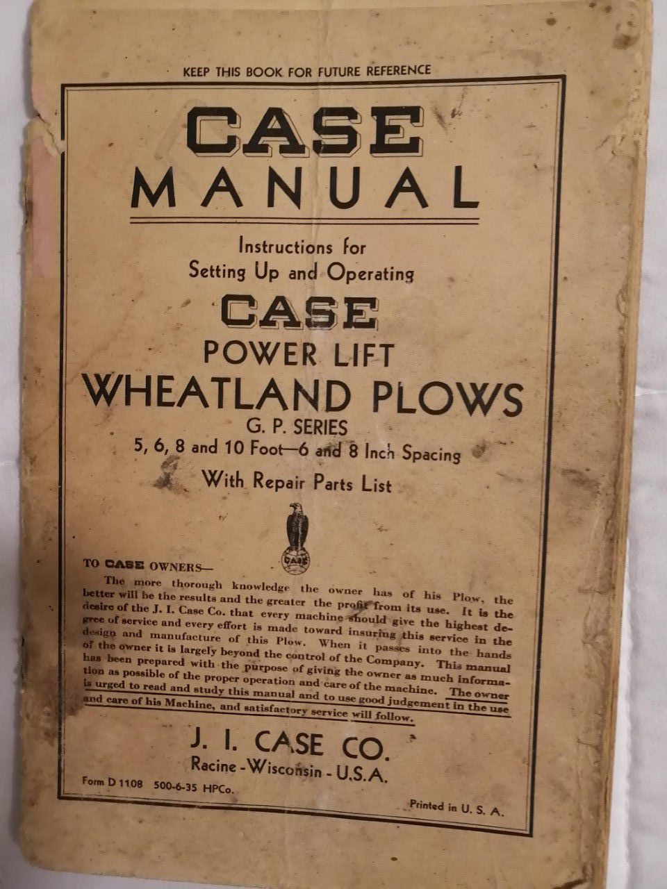 Case manual. Instructions for setting up and operating Case power lift wheatland plows. G. P. series. 5,6,8, and 10 foot - 6 and 8 inch spacing. With repair parts list.