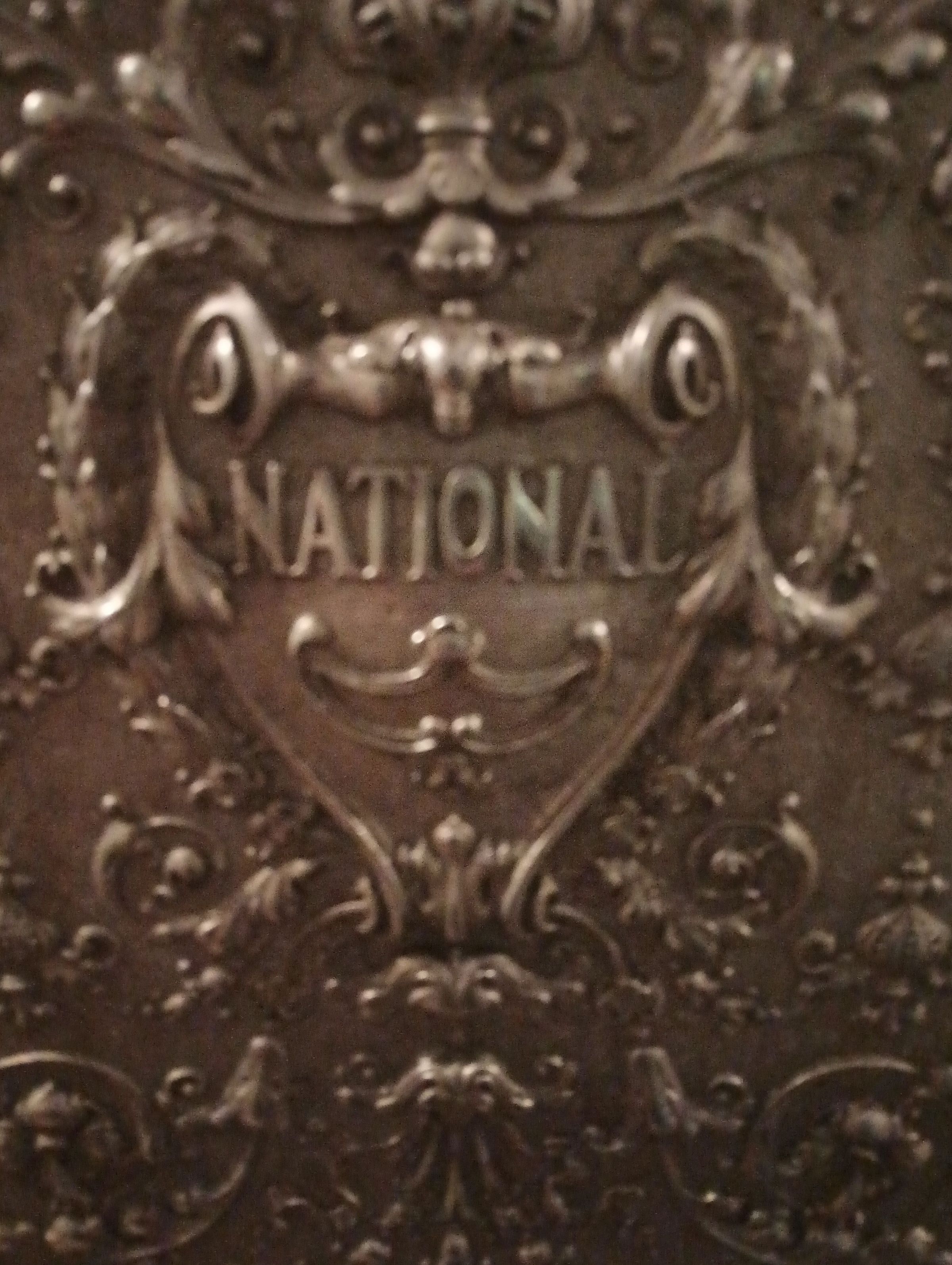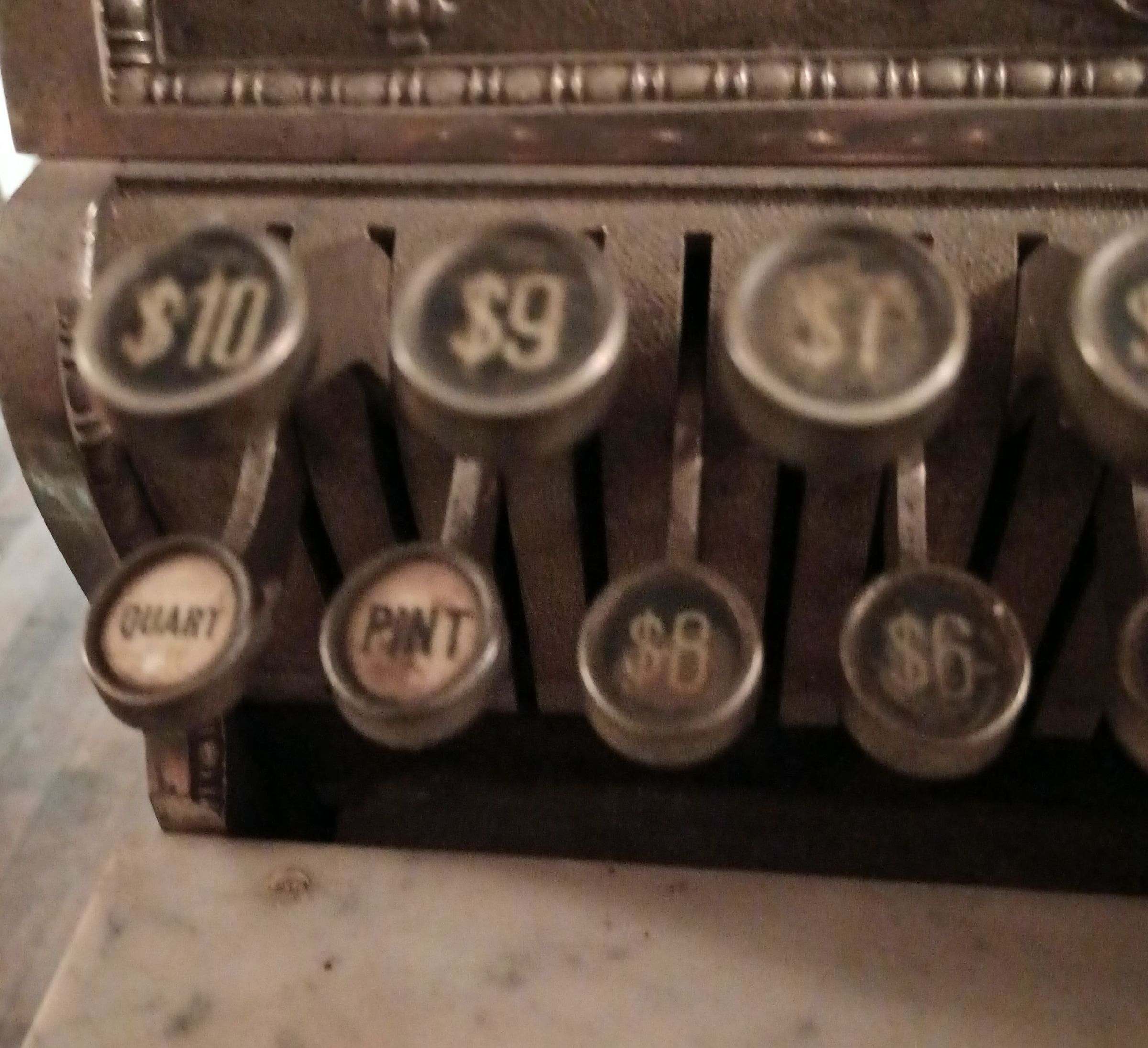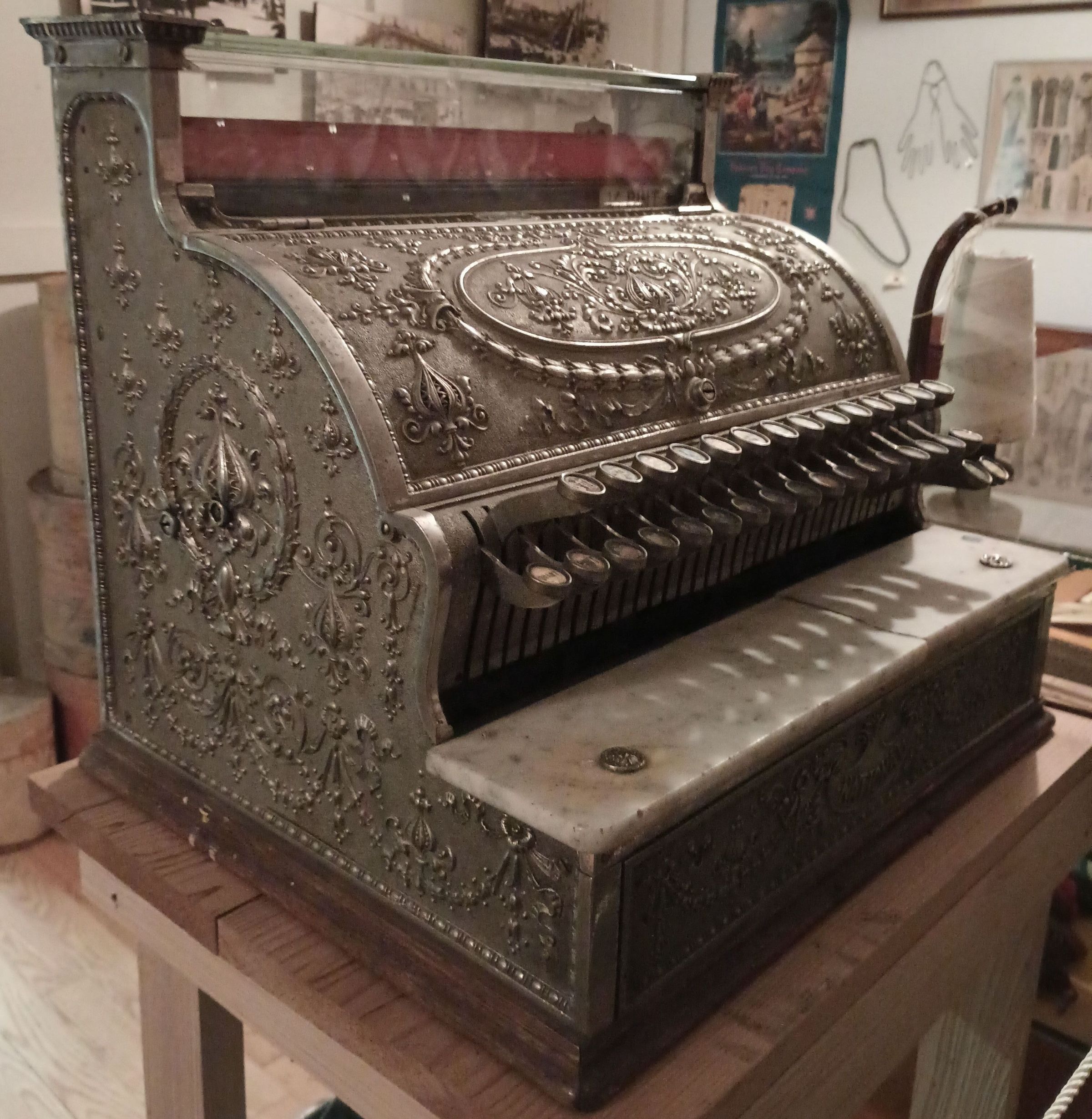 National brand cash register made of nickel plated cast metal in an ornate design. It has a marble cash shelf. Price indicators are covered with glass. Base and cash tray is made of wood. 33 keys include Quart, 1/2 Pint, and Pint.
