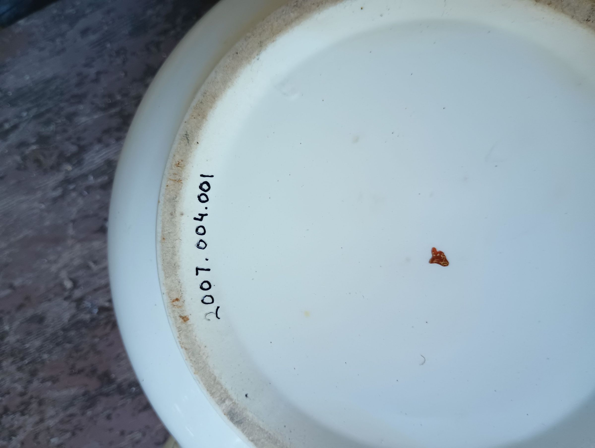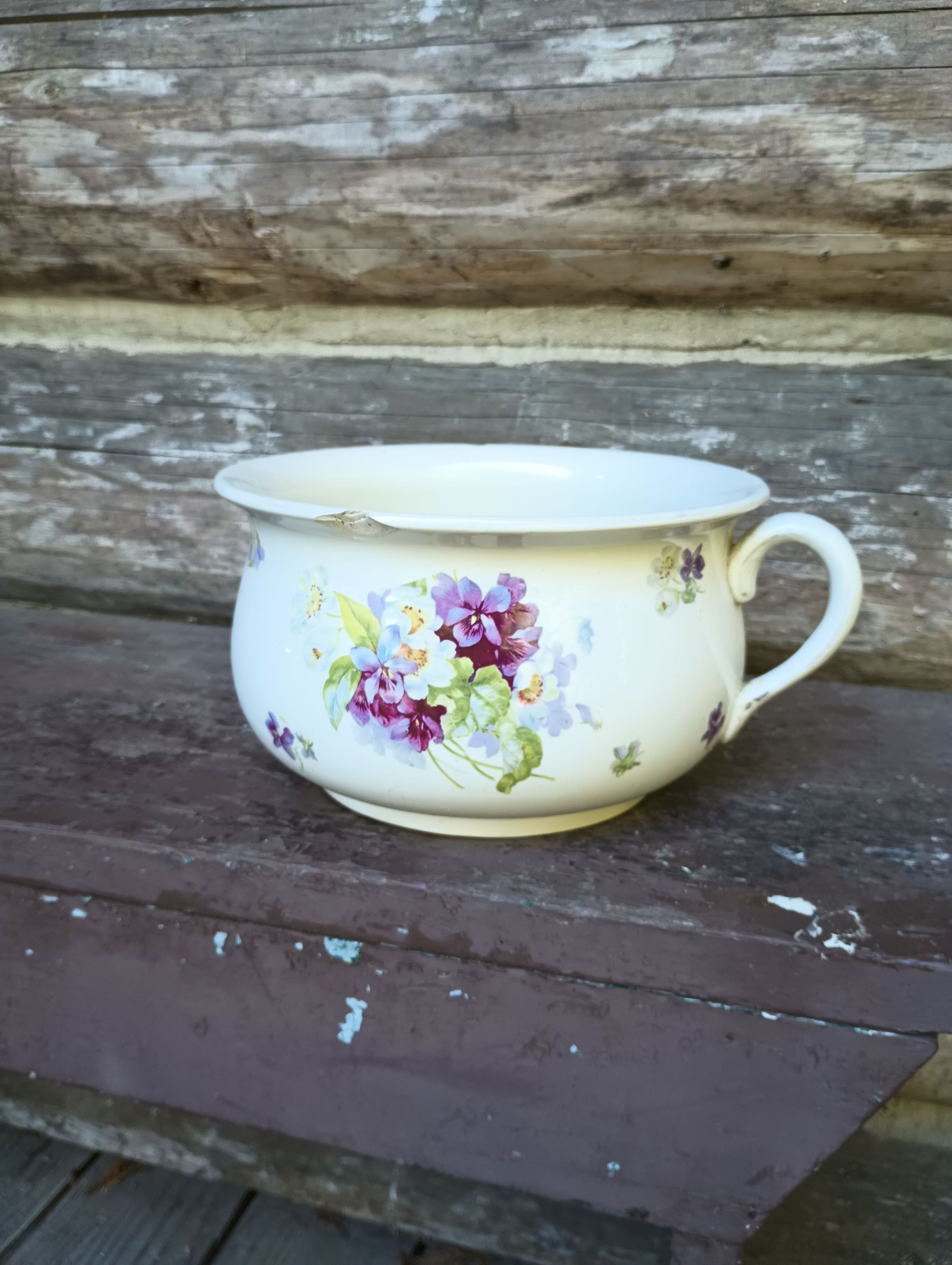 China chamber pot with decorative flower design.One handle, unknown manufacturer.