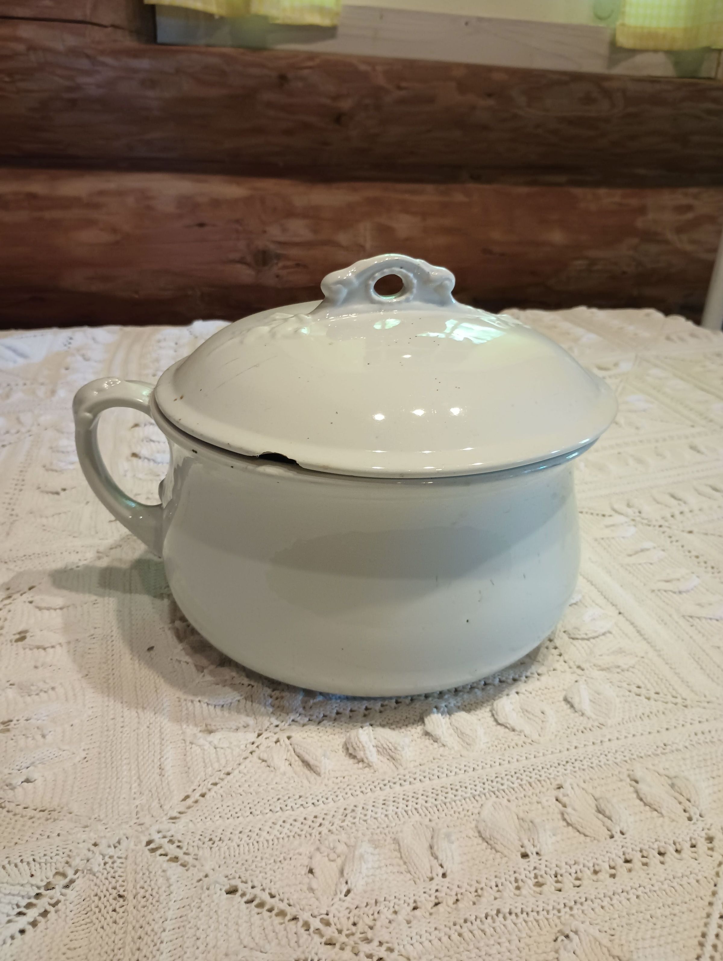 White ironstone china chamber pot with lid and single handle manufactured by J&G Meakin England.
