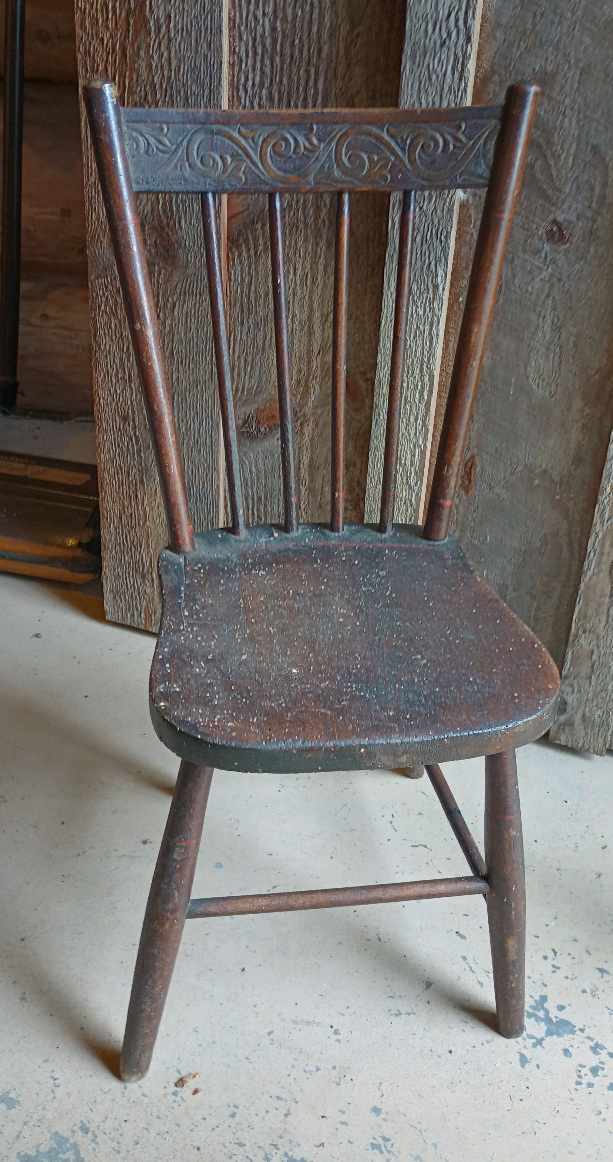 Small wooden child's chair with carved detail on the back rest.