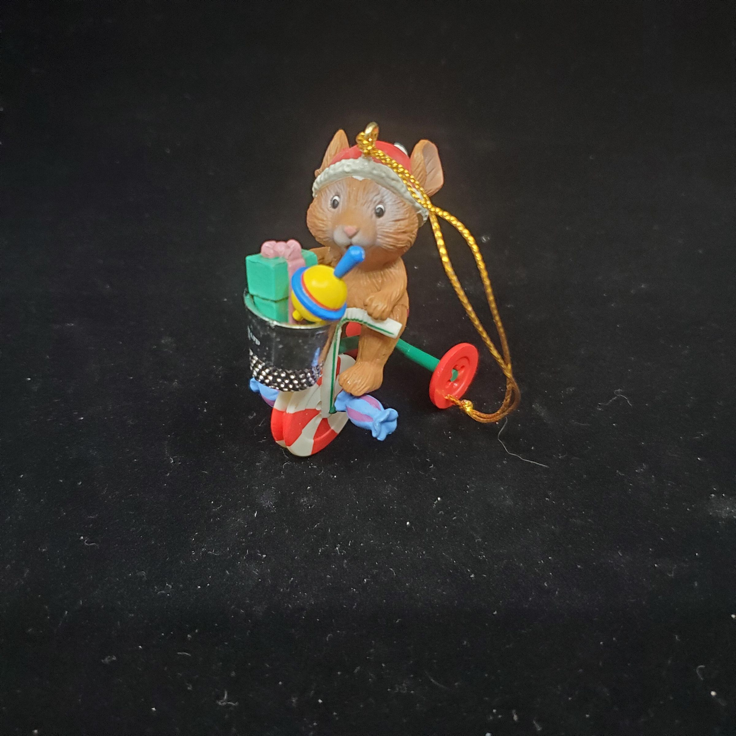 Christmas ornament of a mouse on a three wheel bicycle. HeÕs carrying a thimble carrier at front, full of gifts.Colourful.
