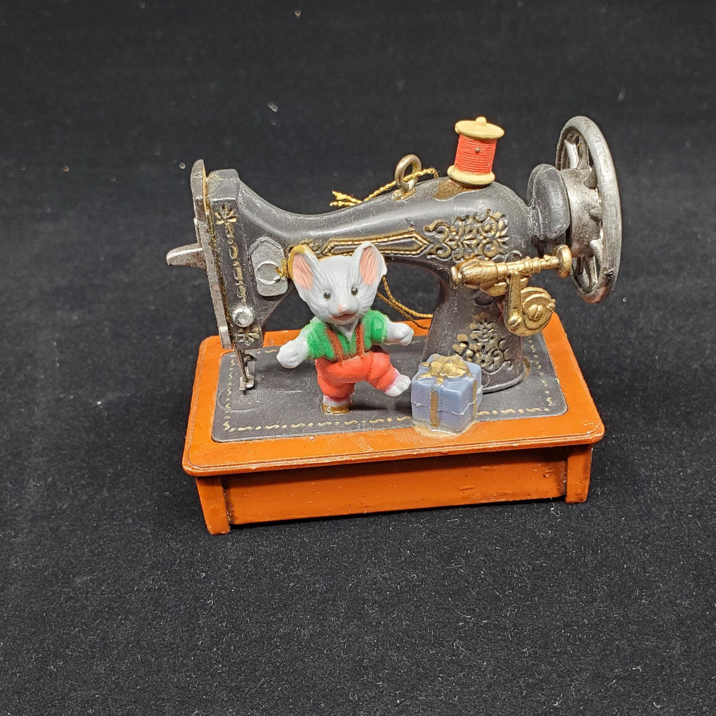 Christmas tree ornament in the form of a table sewing machine. Brown base, black machine, red thread, mickey mouse character standing in front of machine with a gift box. Cord hanger from top of machine.