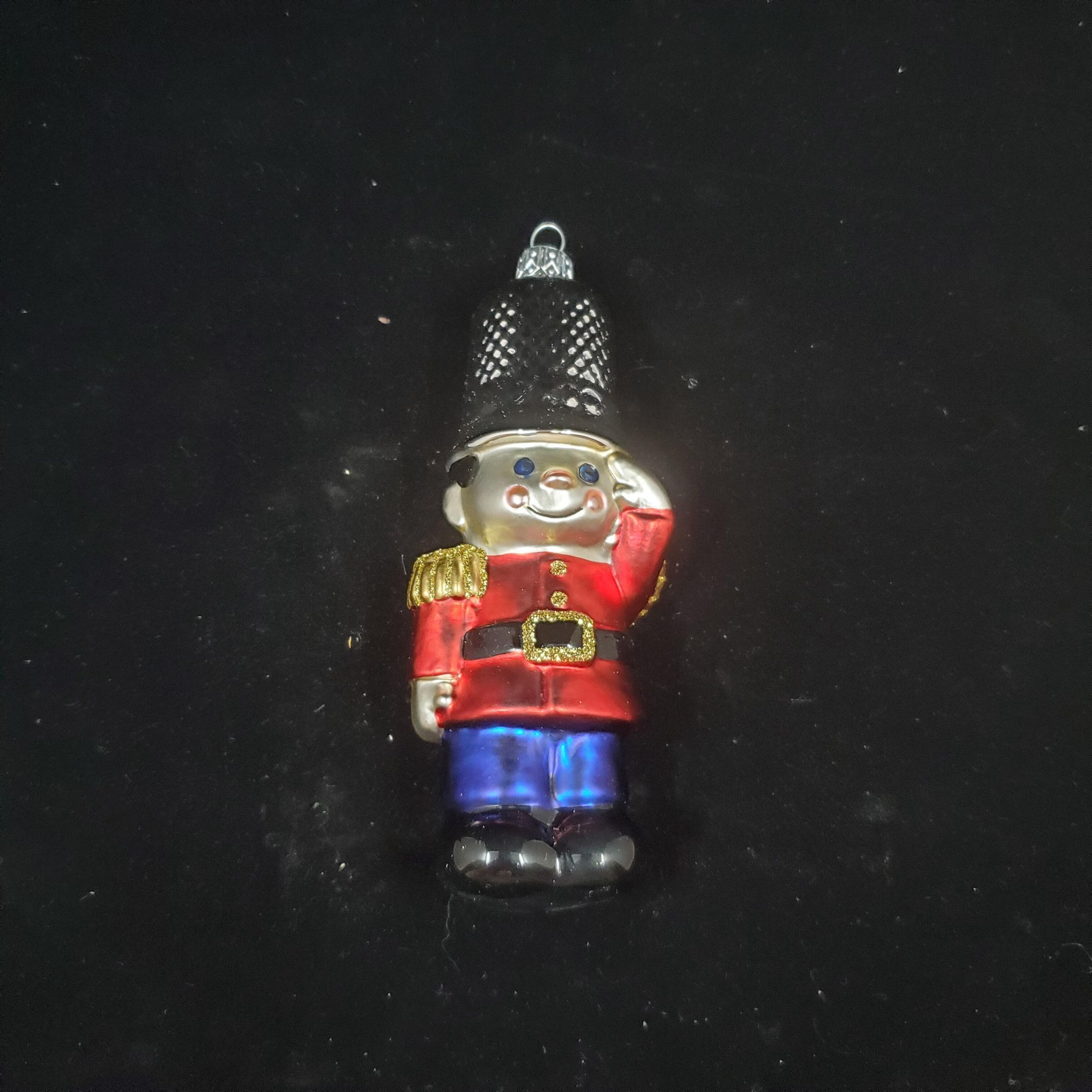 Tree ornament from Hallmark. Blown Glass thimble soldier. Silver thimble hat, red & gold jacket,blue pants. Designed by Sue Tague. Box included.