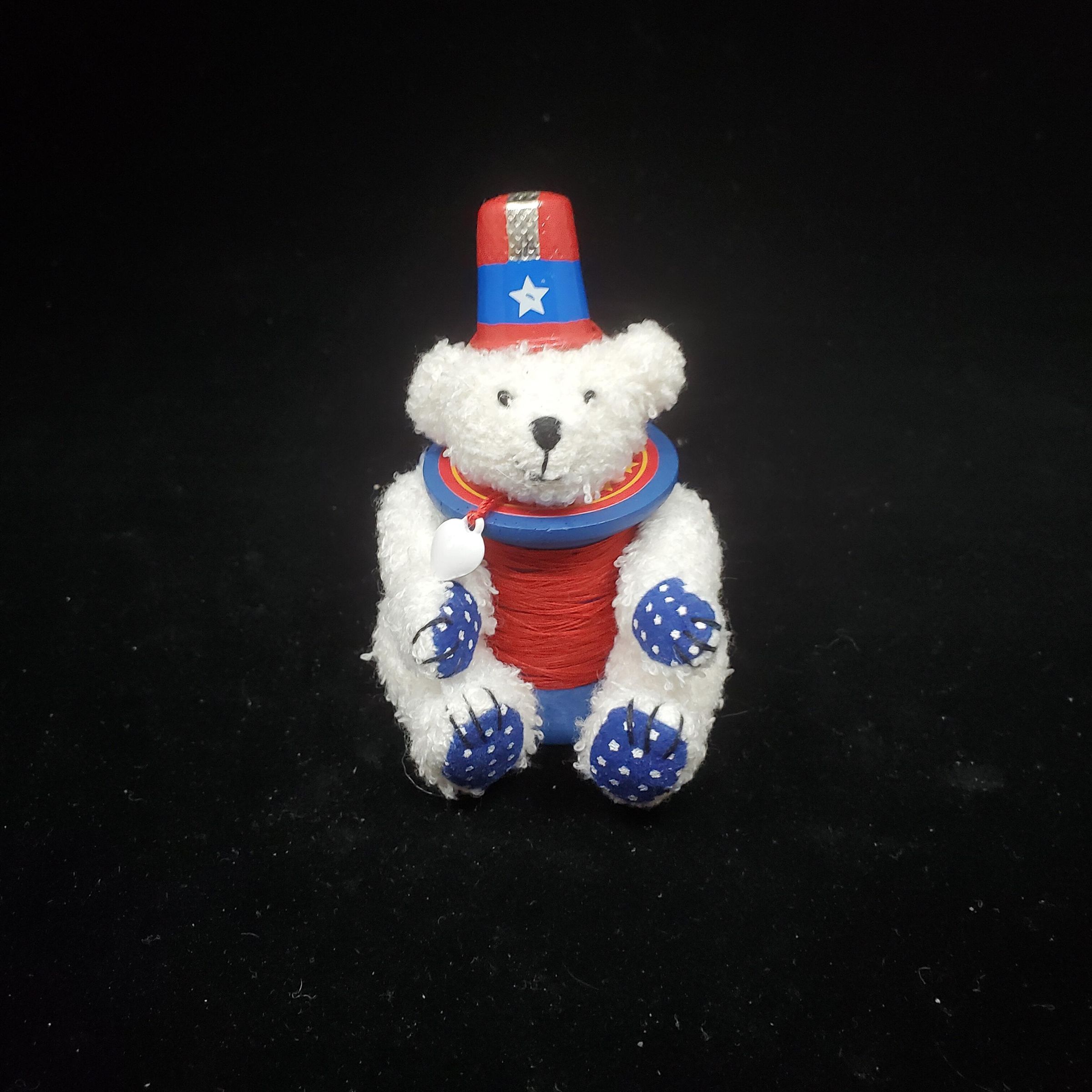 Hallmark keepsake Ornament ÒBearing The ColorsÓ. Patriotic bear of white, blue and white dots amd red. Hat is red,white and blue thimble, body is blue spool with red thread. Original box.