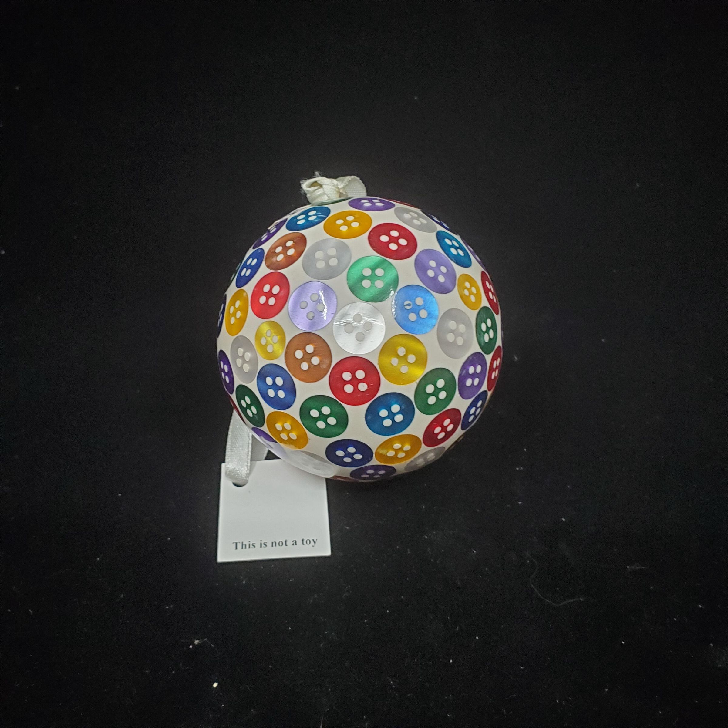 Christmas tree ball - white. Covered with coloured buttons, red, green, blue, purple, yellow, brown. White ribbon hanger. Original box reads Made in India.