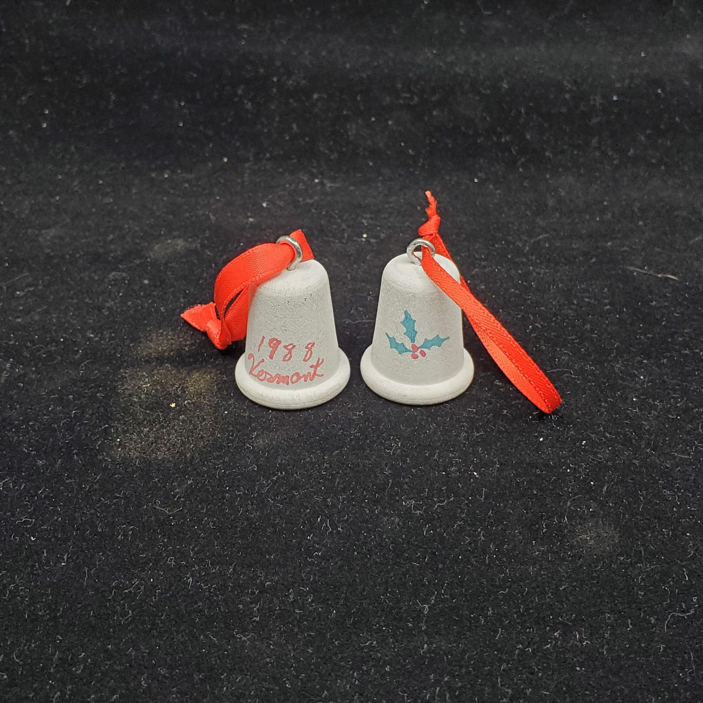 2 wooden Christmas bells, painted white, in thimble shape. Metal ring in top to hang, red ribbon hanger. Holly leaves, green, with red berries painted one side. Other side reads 1988 Vermont.