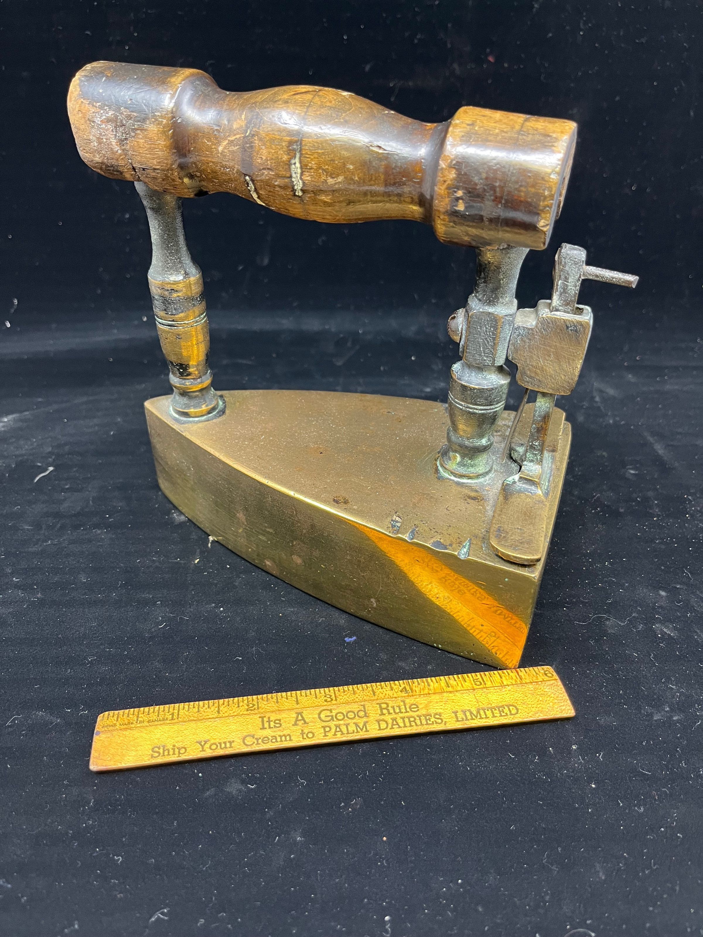 Brass cloths iron with compartment for coals and wooden handle