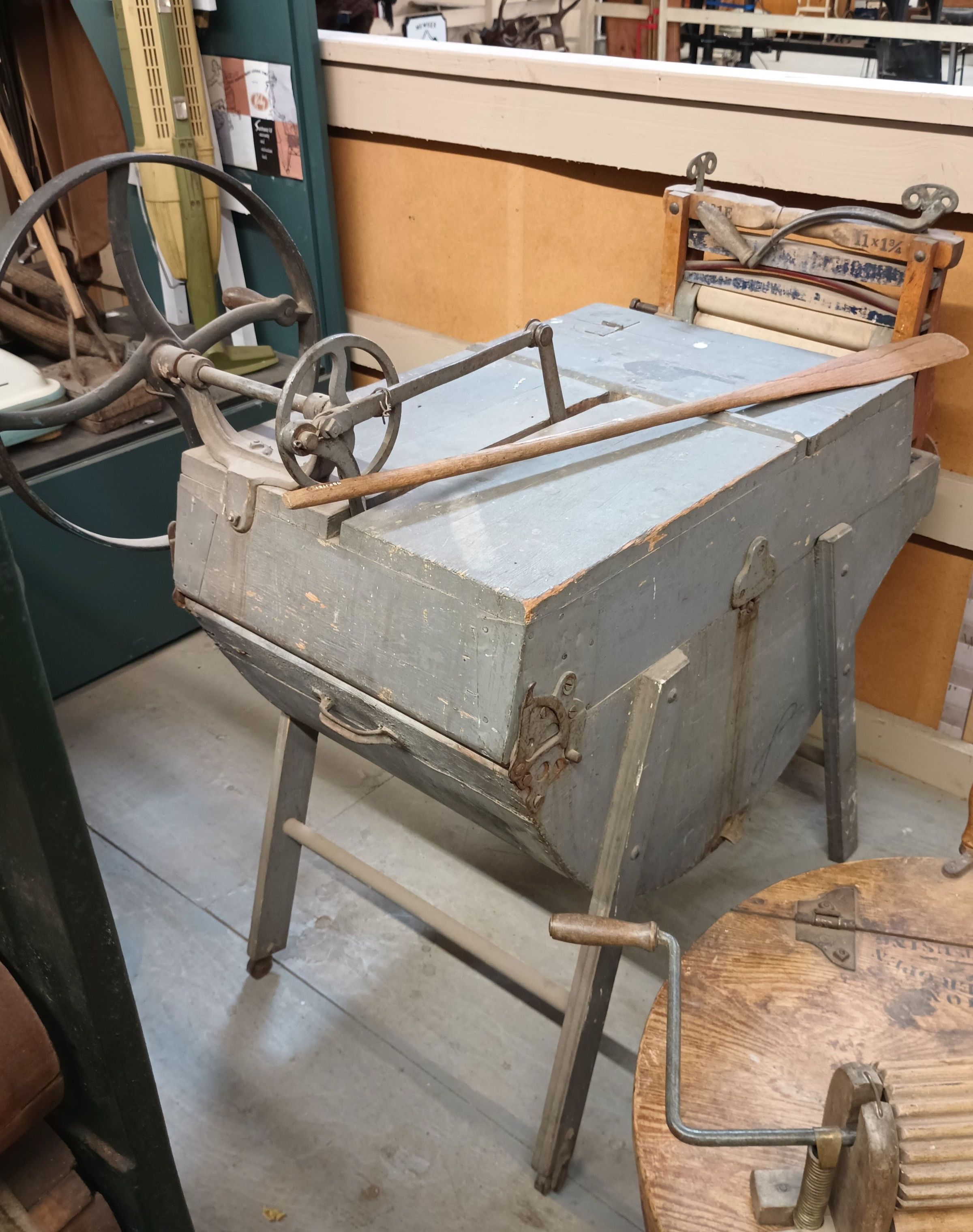Made around1890 and used to 1916. Hand operated dasher type washing machine.
