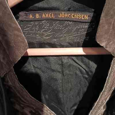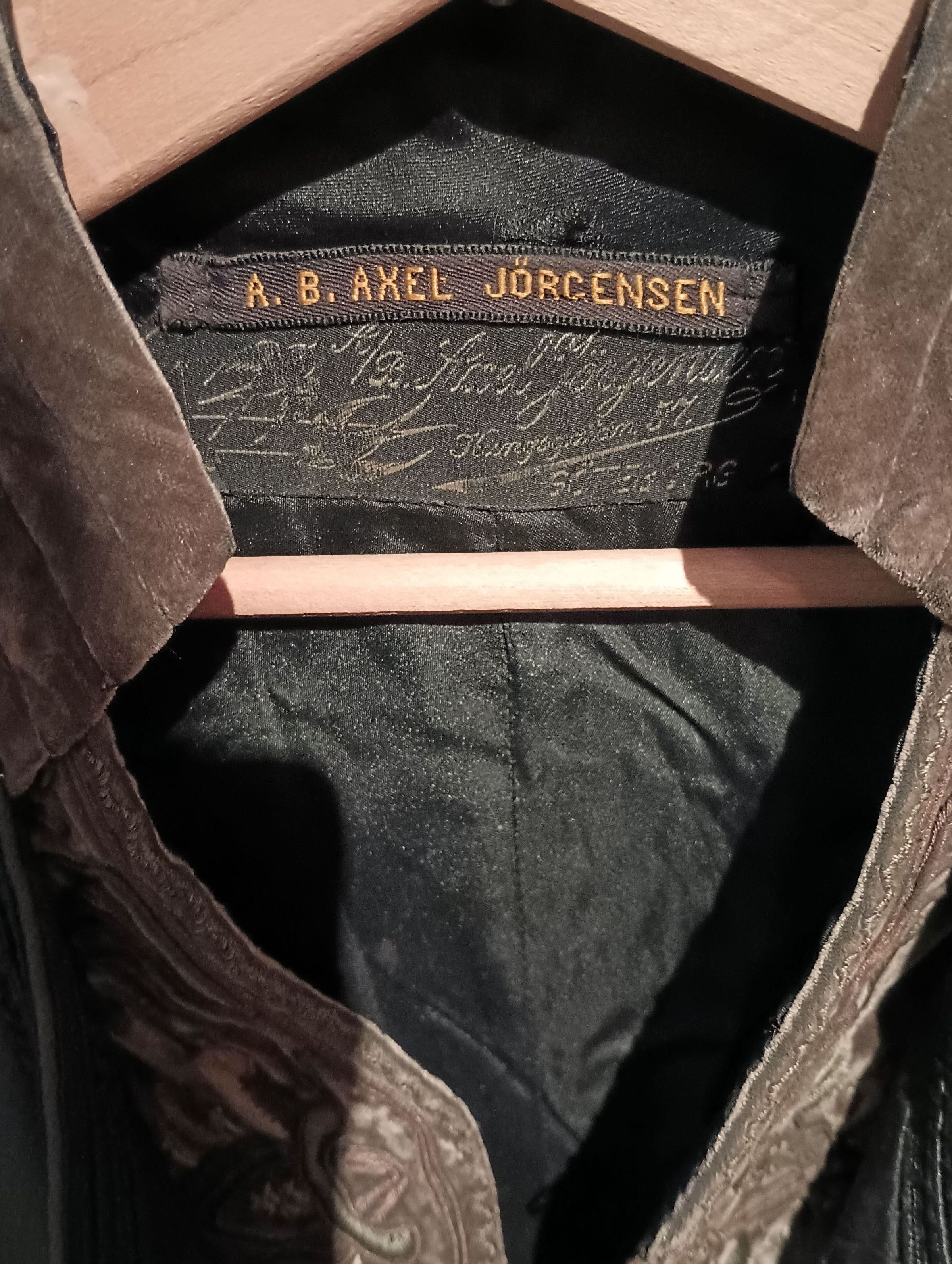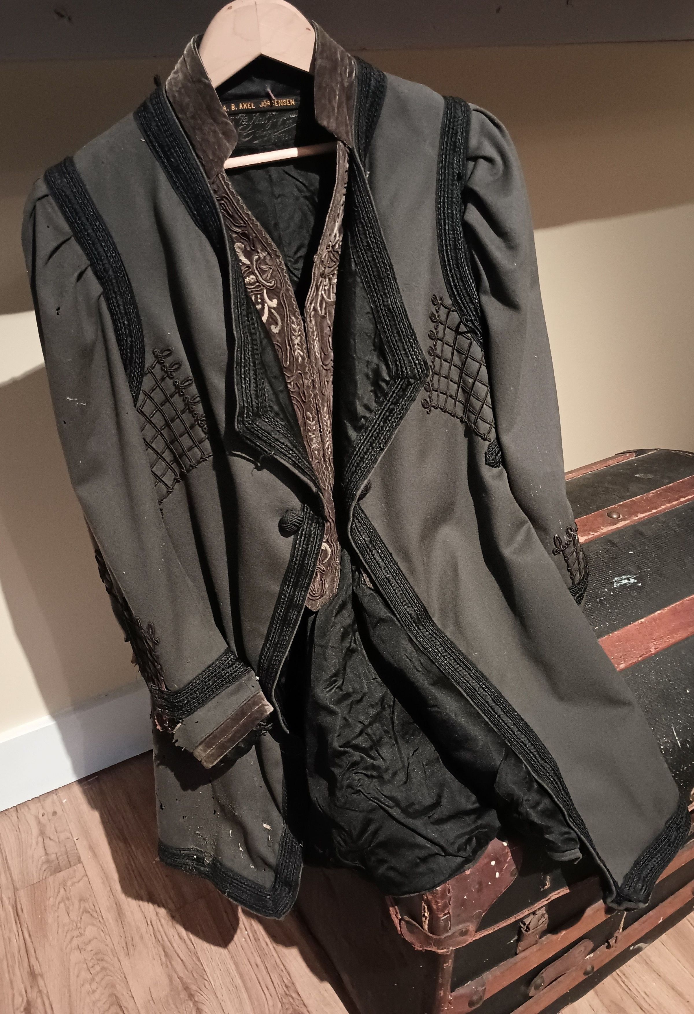 Taupe coat with black braid trim and faux vest of brown velvet. Label reads "A.B. Axel Jorgensen"