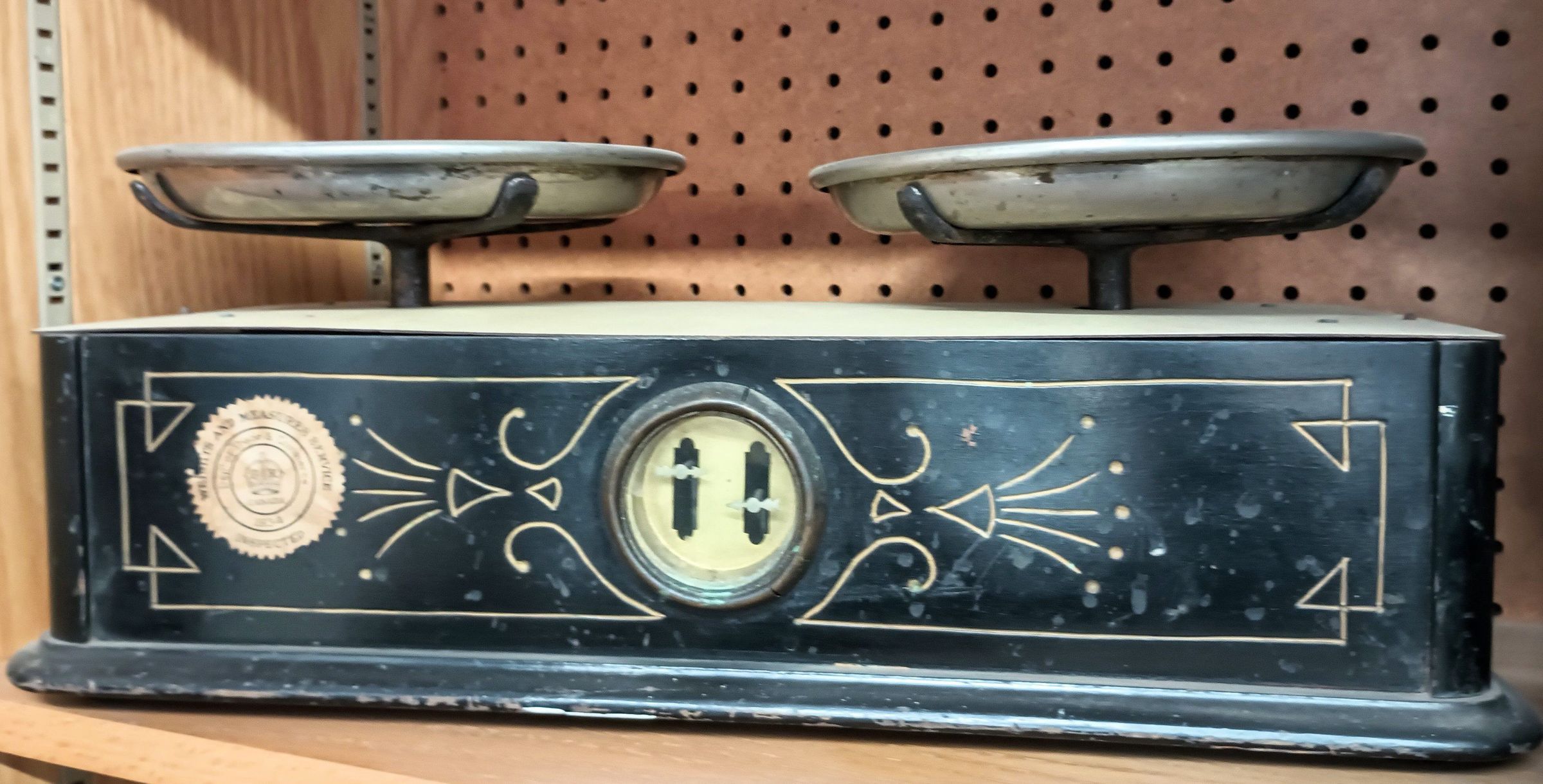 Black metal balance scale with brass pans manufactured by Henry Troemner, Philadelphia. Model 4127Use