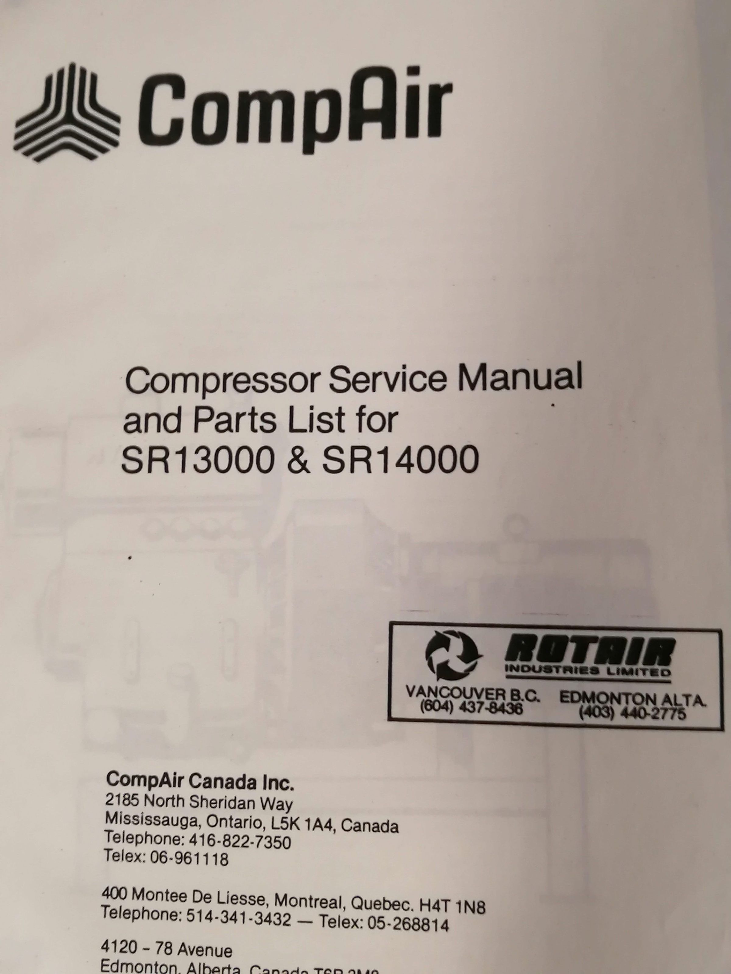 Compressor service manual and parts list. SR13000 and SR14000