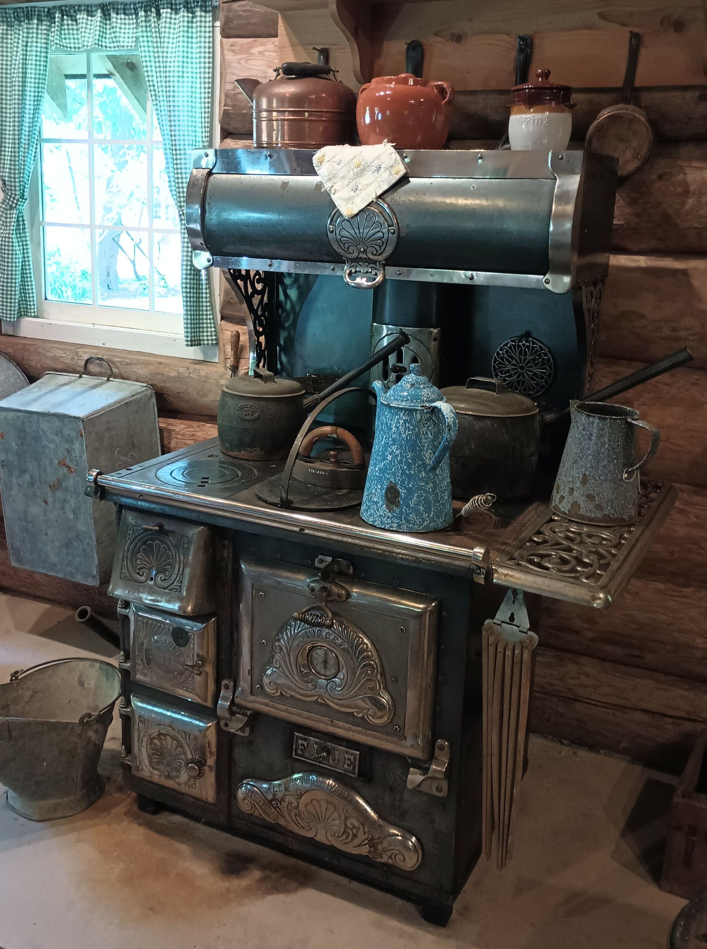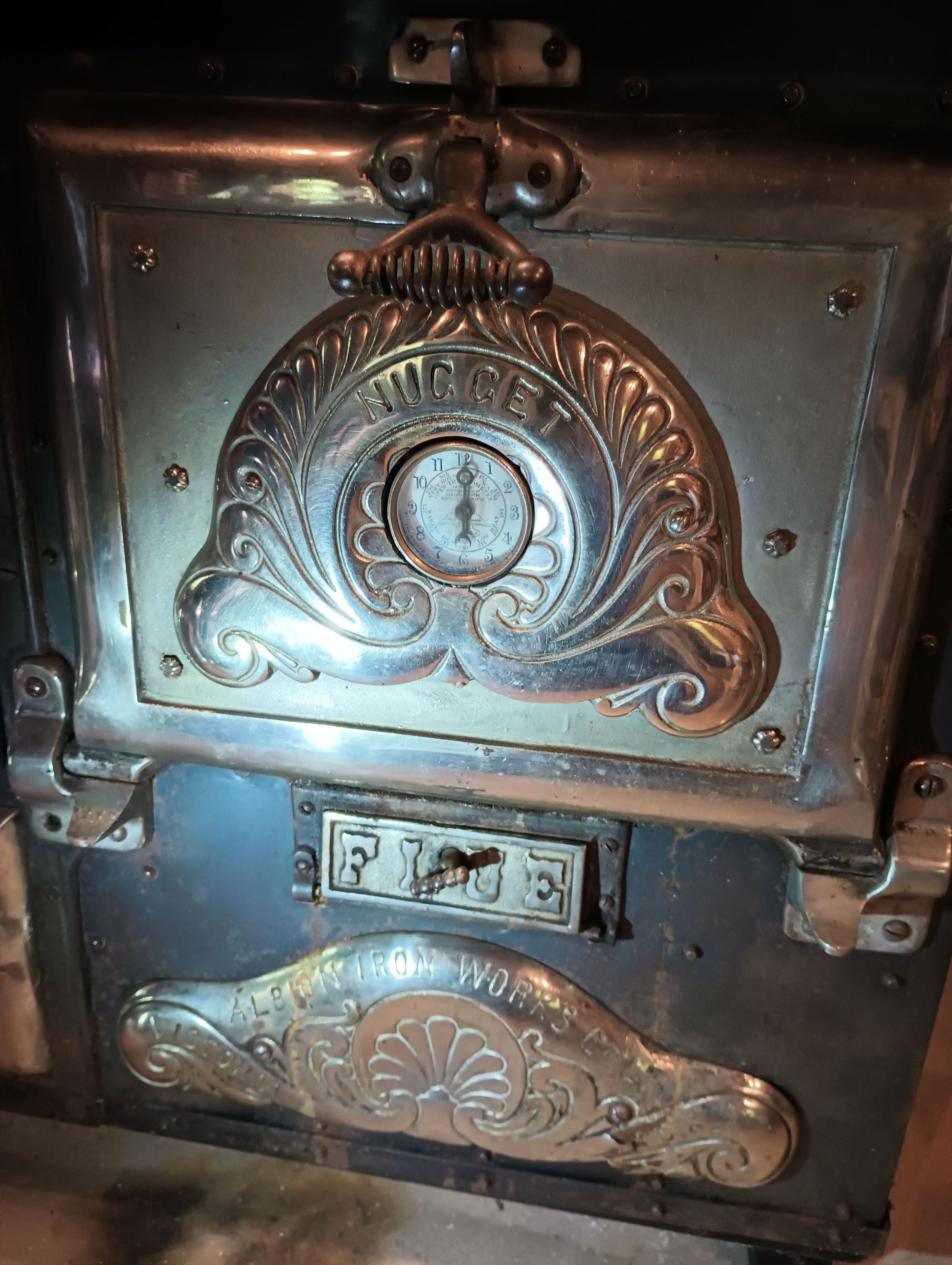 Nugget cook stove manufactured by Albion Iron Works, Victoria BC. The range is made of cast iron and steel. It has a warming oven on top, a side table and two moveable metal shelves. There are six lids, one of which has three opening sizes, a lid lifter, a towel drying rod and towel rack. There are many decorative details including an elaborate medallion on the oven door.Context