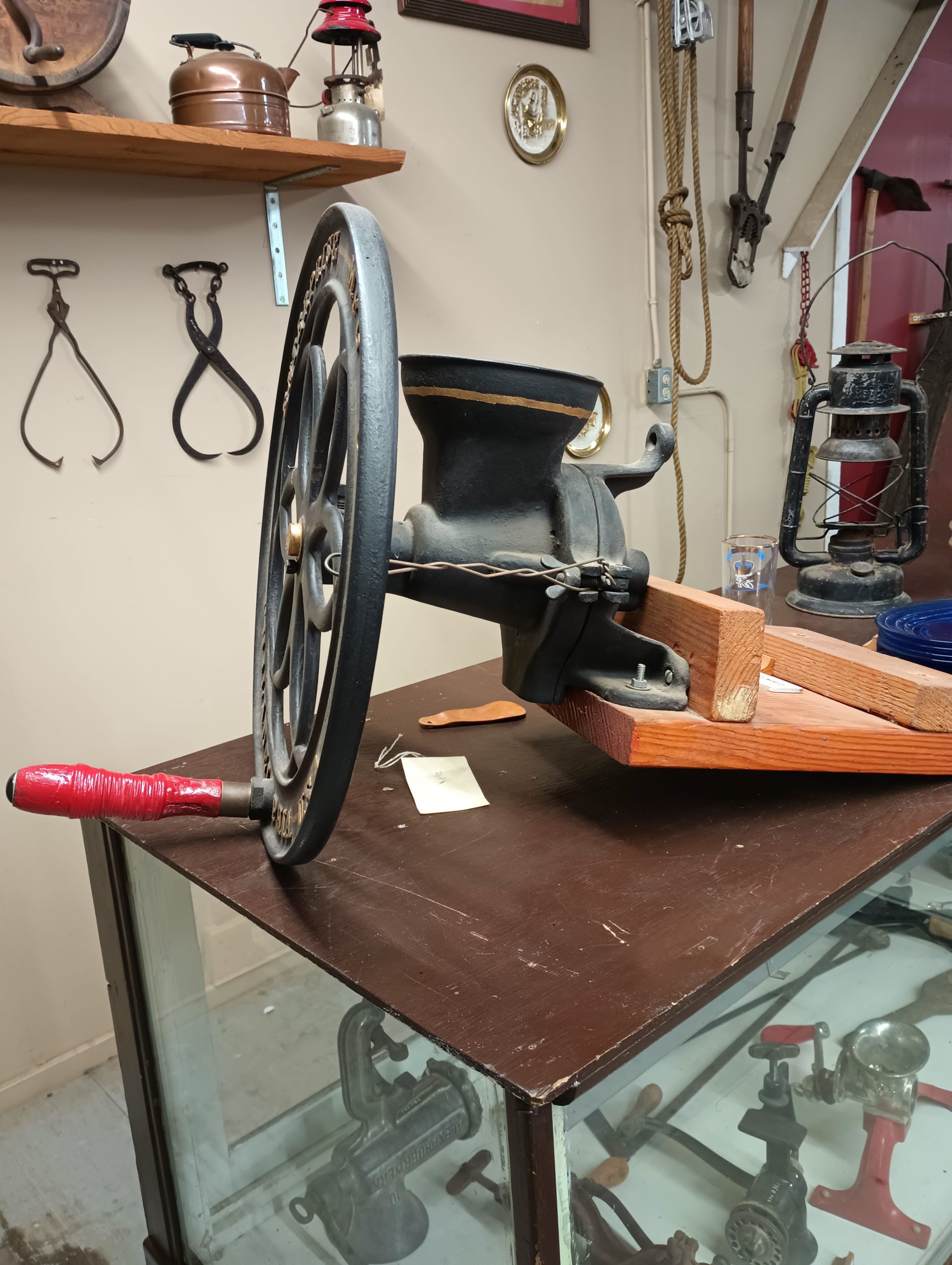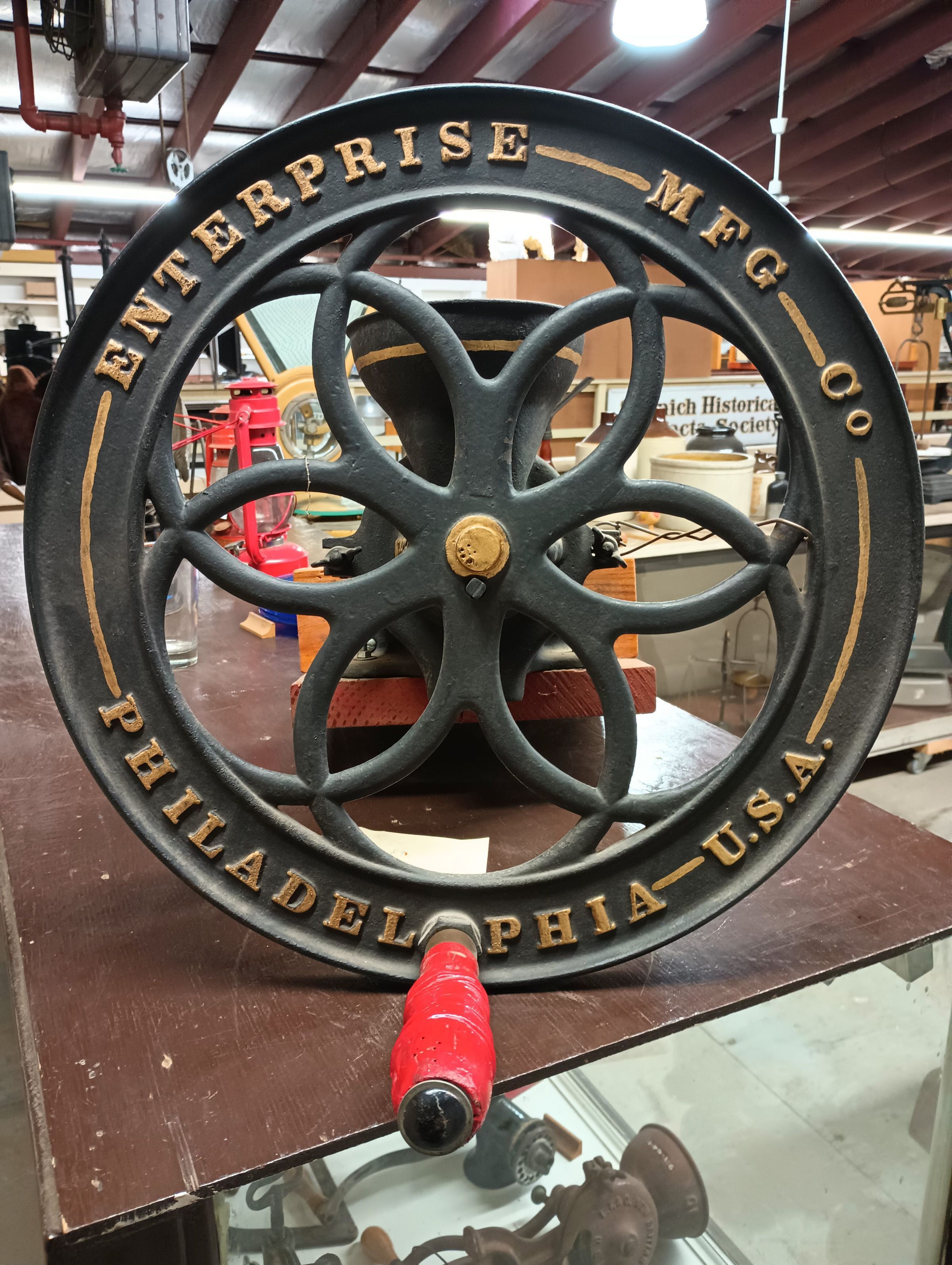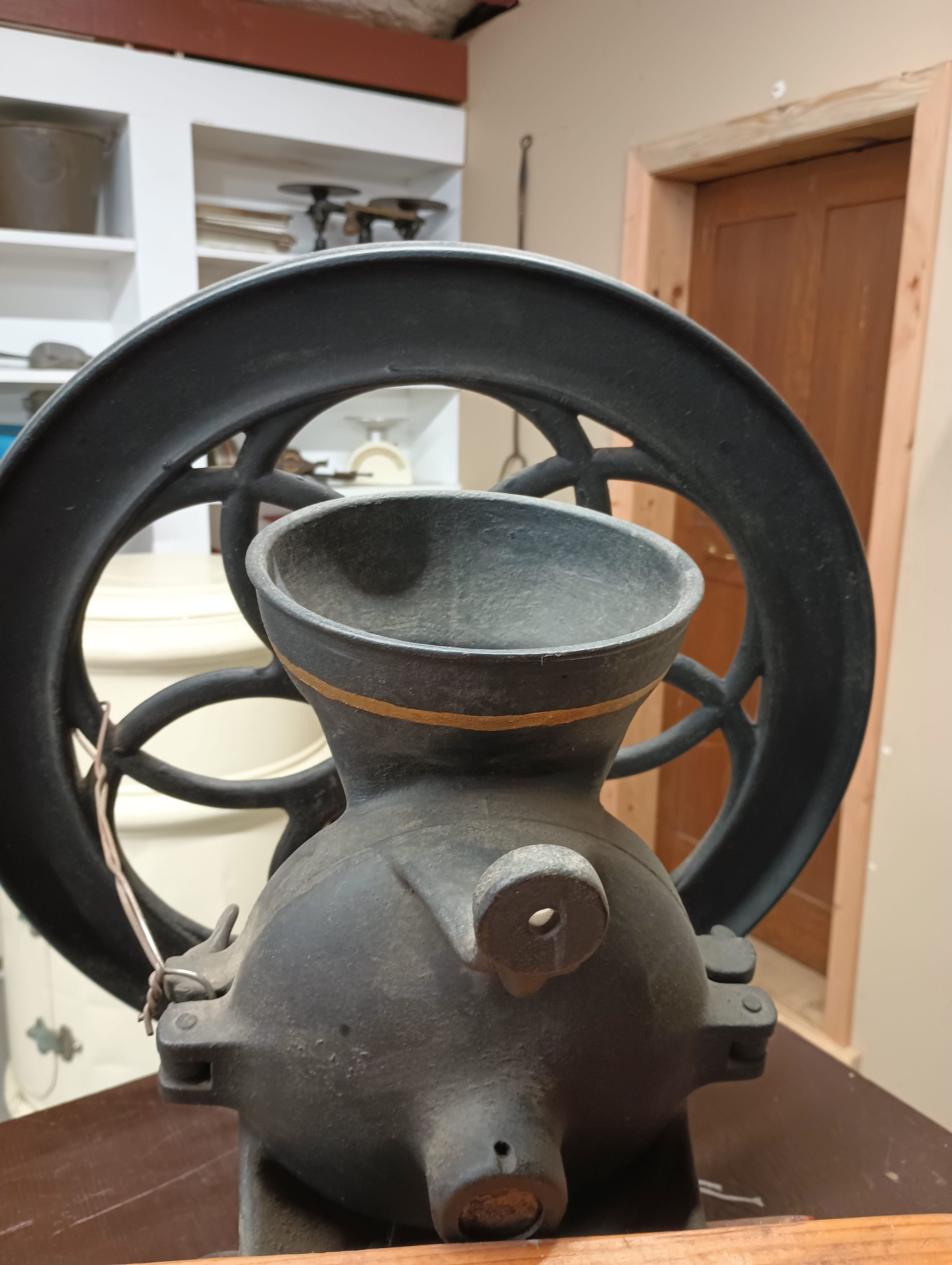 Cast iron mill with large hand driven wheel. Black and gold coloured, attached to a wooden block.Context