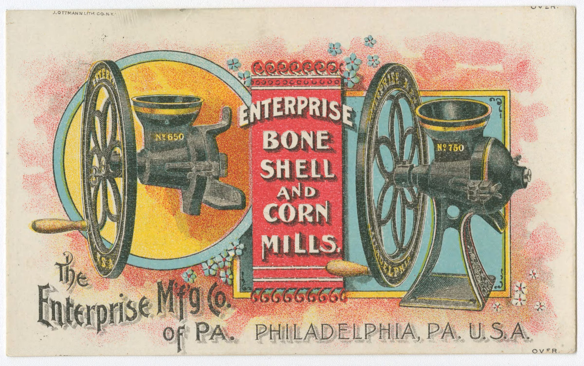 Manufactured by the Enterprise Manufacturing Company of Philadelphia. Text on the back of the 1895 advertising card below says " The Best General Mill You Can Buy. Enterprise Bone Shell and Corn Mills. Capacity, 1 1/4 bushels of corn per hour. Especially adapted for grinding Dry Bones, Shells, Corn, Roots, Bark, Grain, Chicken Feed, Salt, etc. These Mills will not grind "Green Bones." No. 650, $7.50. No. 750, $7.50 "