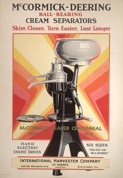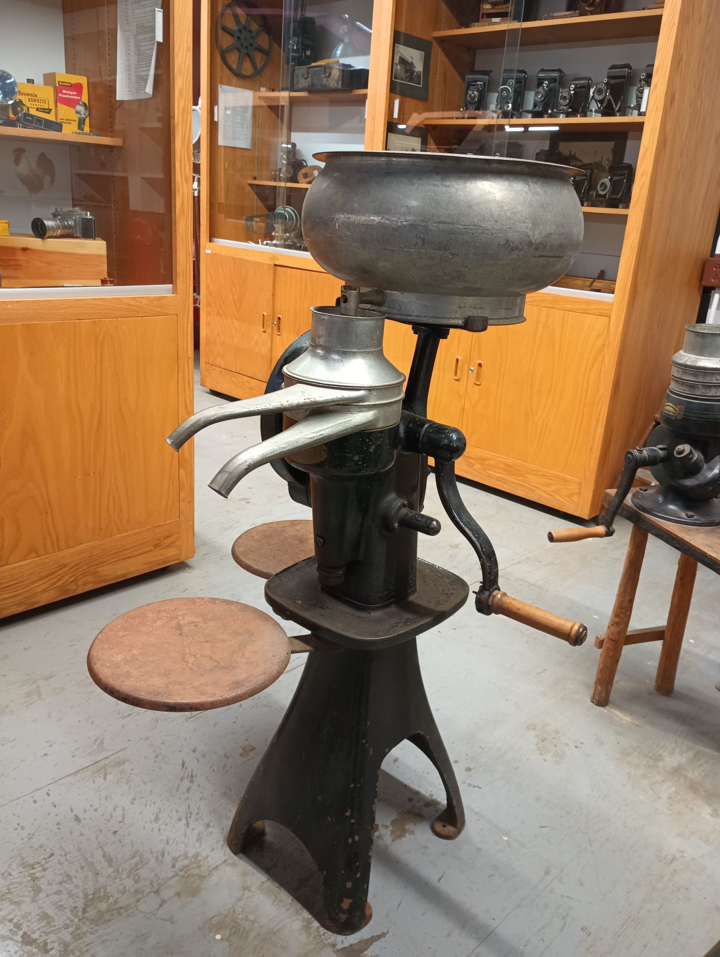 The device separates milk into cream and skimmed milk. Milk is poured into the large bowl, and using the handle, the separator is spun, causing the milk to cling to the sides, while the cream collects in the middle. Platforms attached to the stand hold buckets to collect the cream and milk.