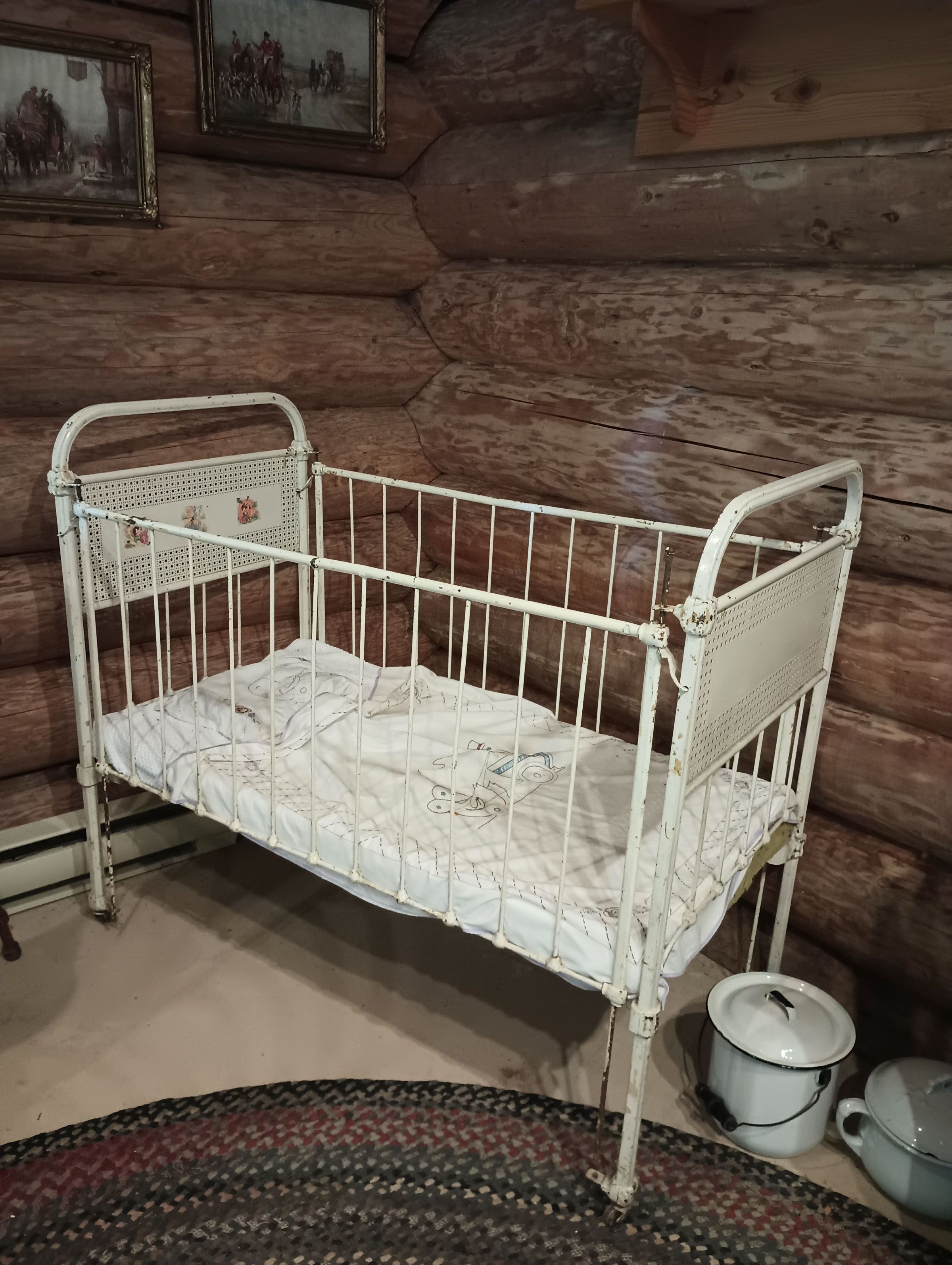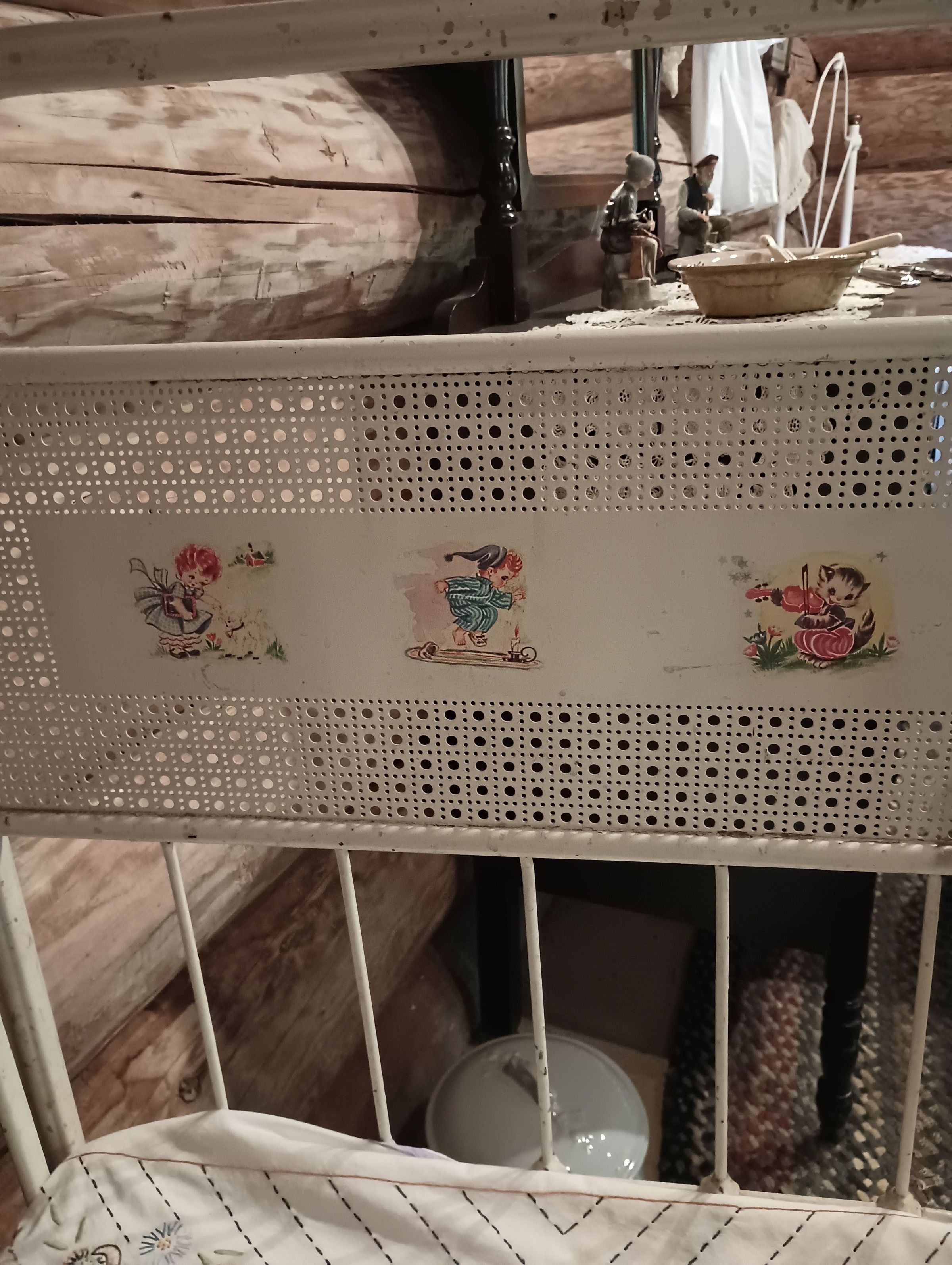 Painted white metal child's crib with decorative pieces at head and foot, including 6 small decals.