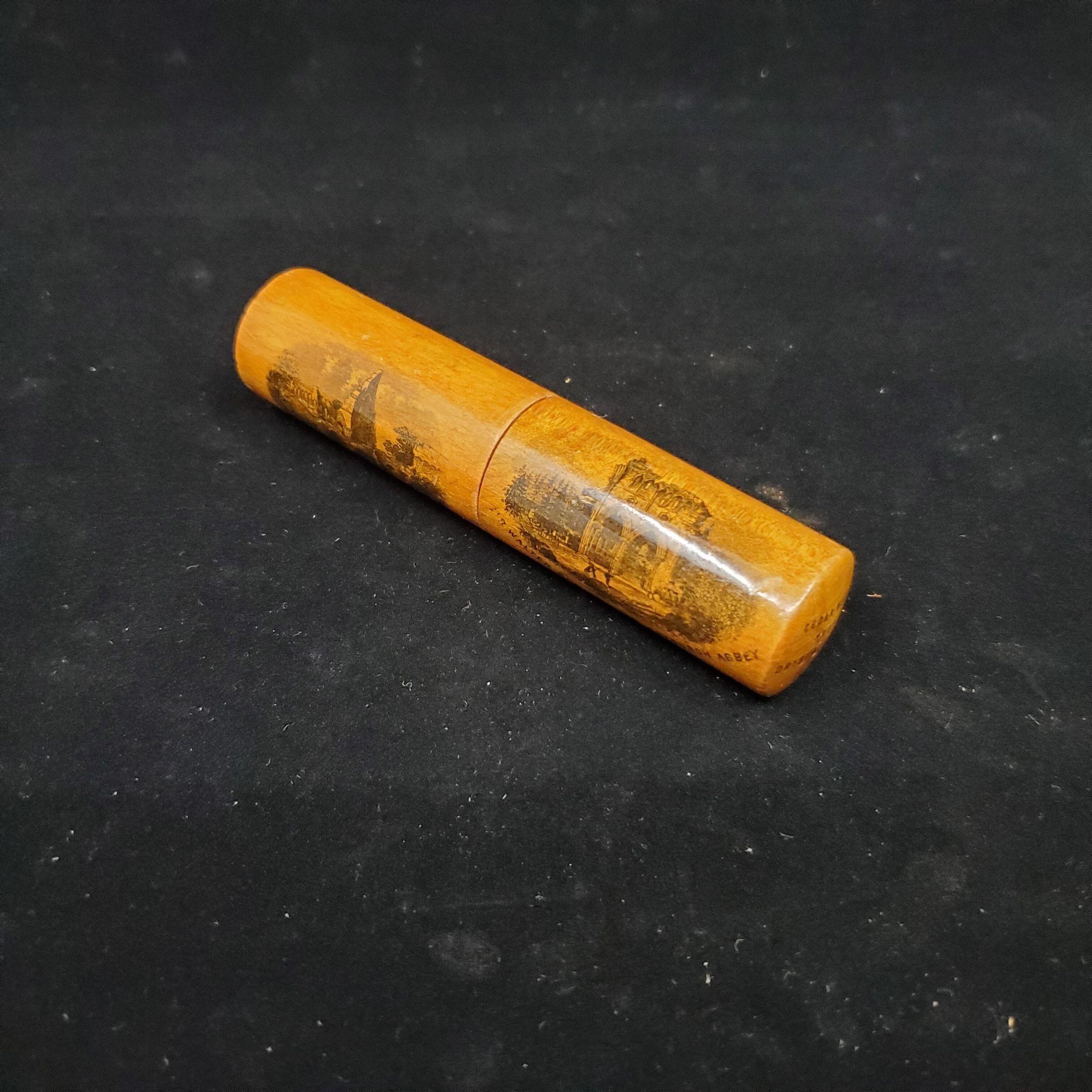 Tambour hook case in wood. Called Mauchline Ware. usually syc amore wood - medium brown colour. Round cylinder type case . 2 prints on outside, one of Dryburgh Abbey, the other Sir Walter ScottÕs Tomb, Dryburg Abbey.Inside center large hole with 6 small holes around . Center for handle, small ones for different size hooks. 2 hooks only remain and bodkin.