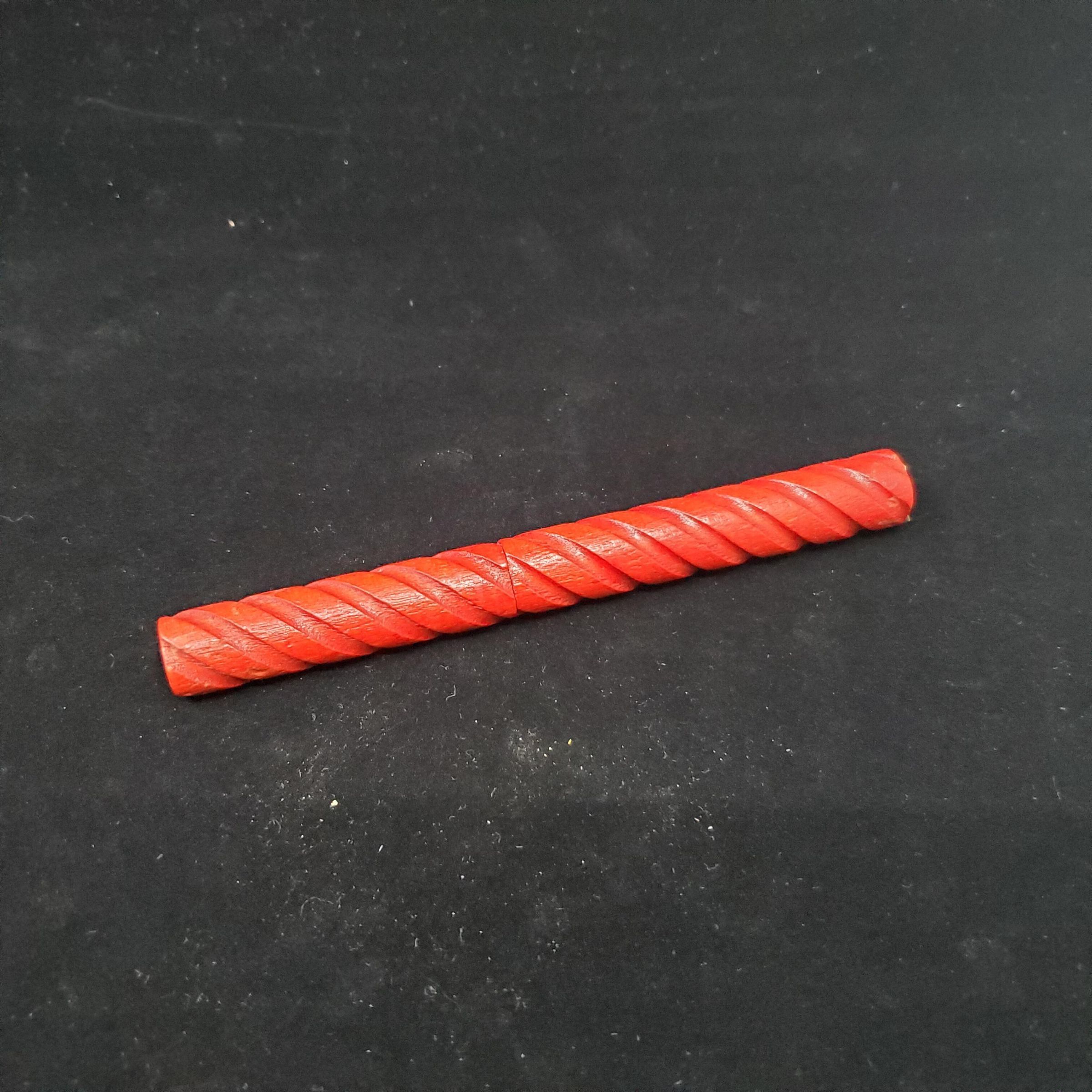 Red wooden spiral case. Push on top. Case contains 1 steel crochet hook .