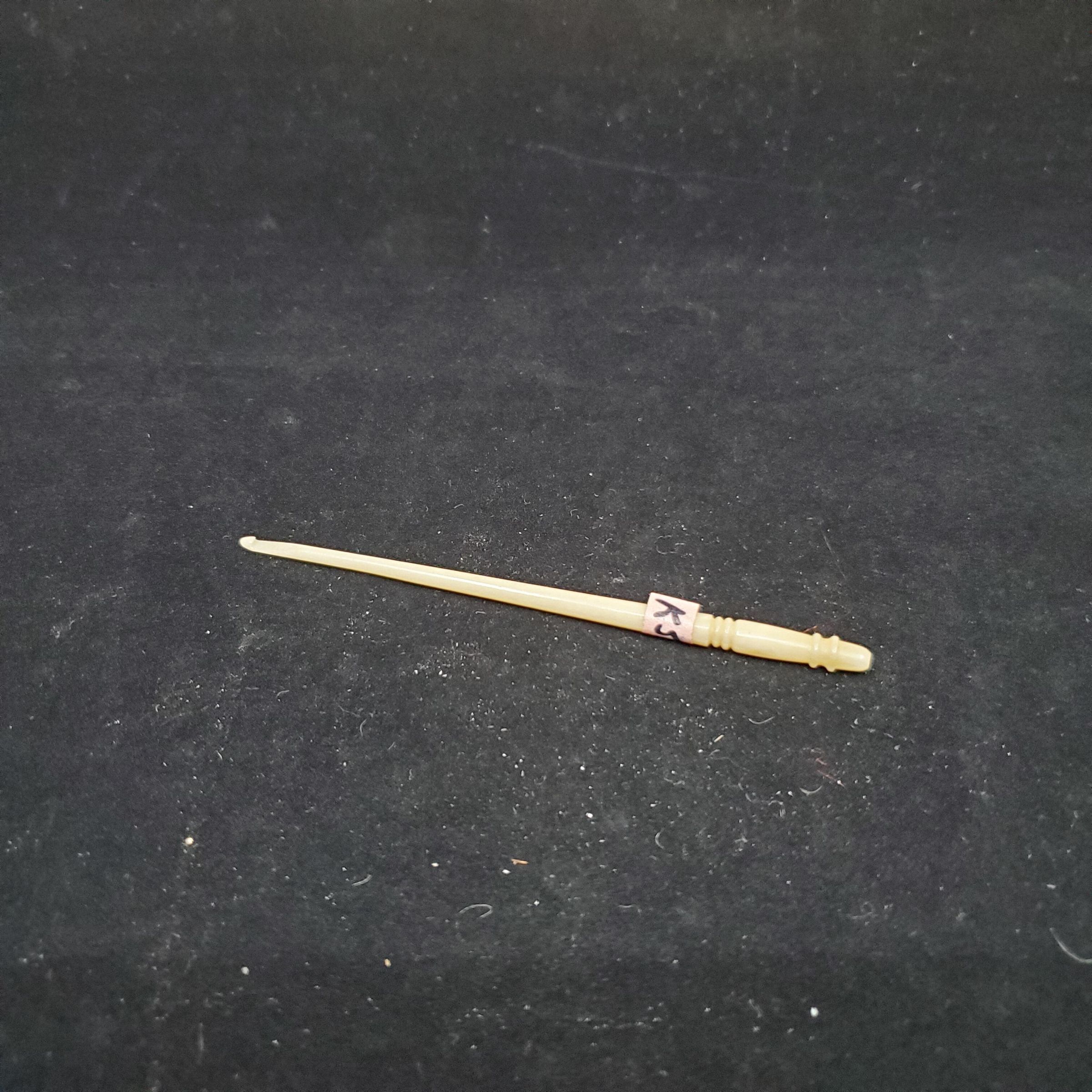 Bone crochet hook with indented line design on handle.