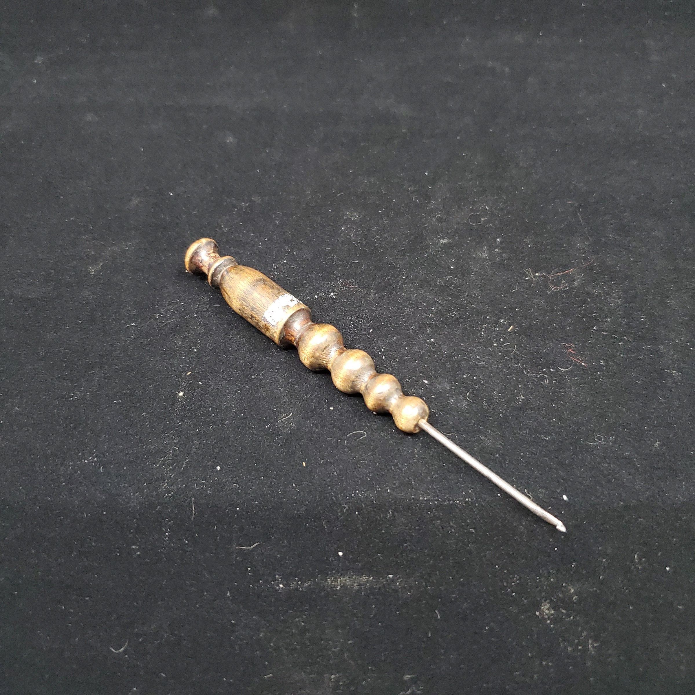 Steel fine crochet hook with dark brown wooden handle. Handle much darker than shown in picrture. Nicely turned with dmall pice out of one of the round, which looks like it was there when made.