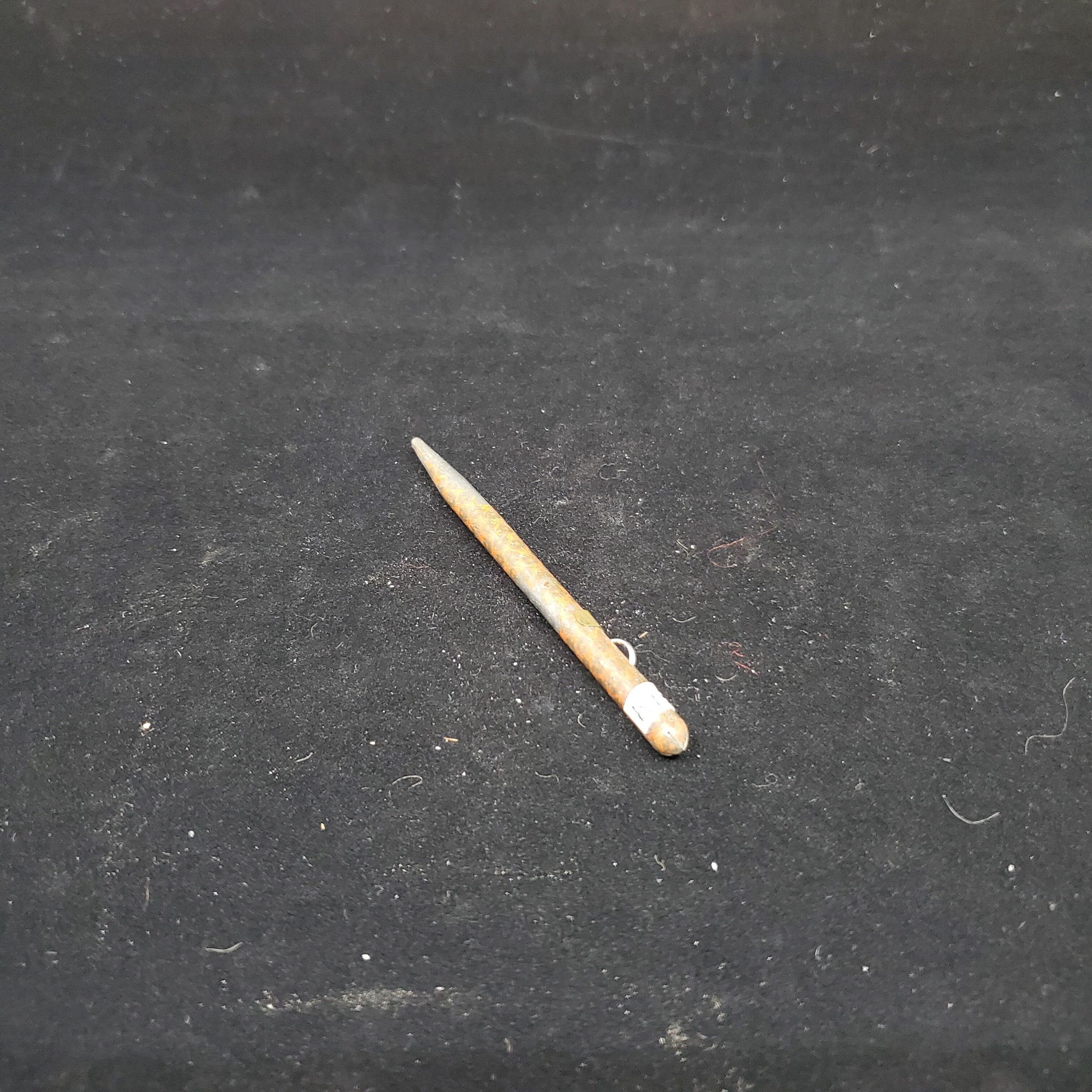 Steel crochet hook in steel pencil like container. Slides up and out of container. Container painted brown and black.