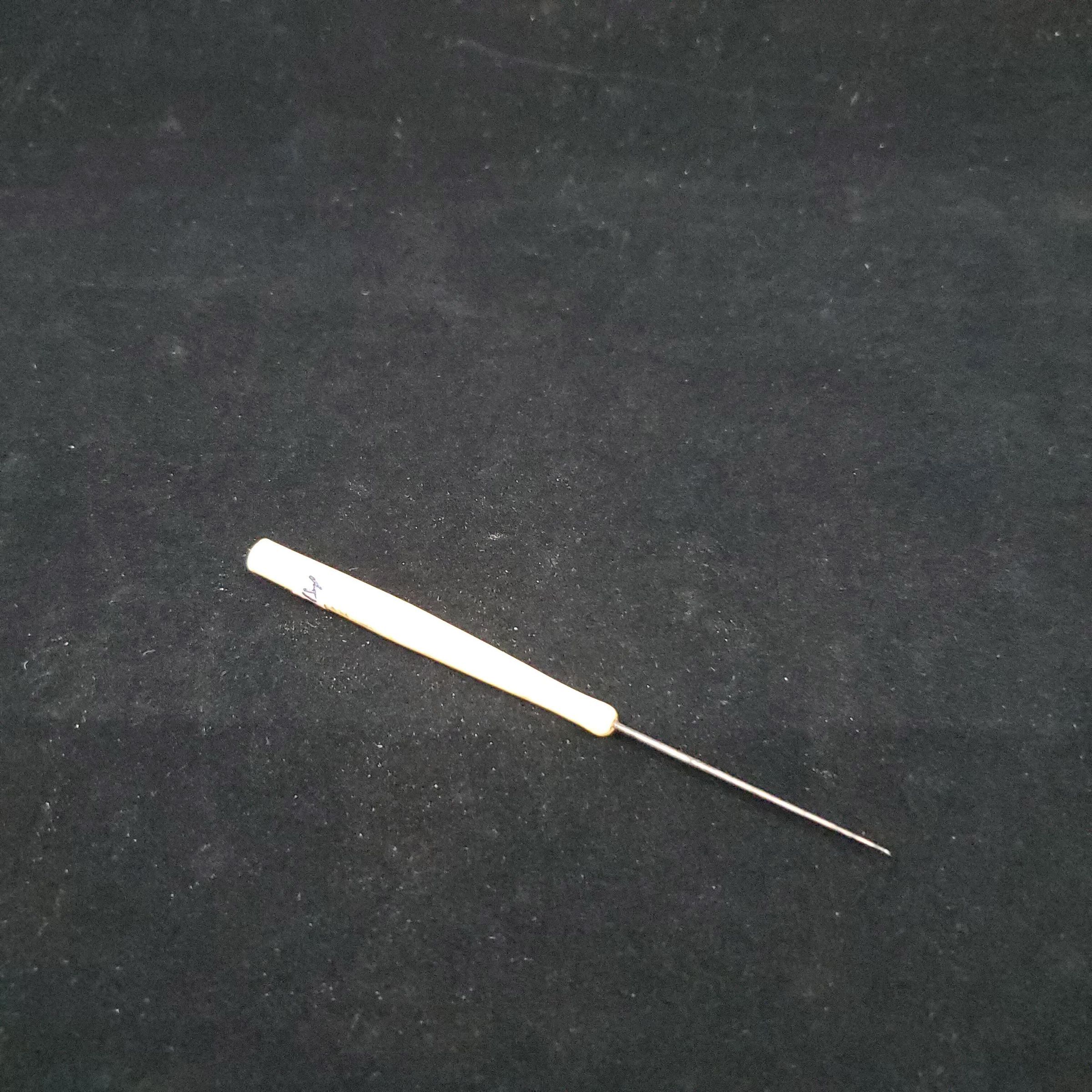 Steel crochet hook with a tubular bone handle. White bone with light brown markings. Hand crafted.