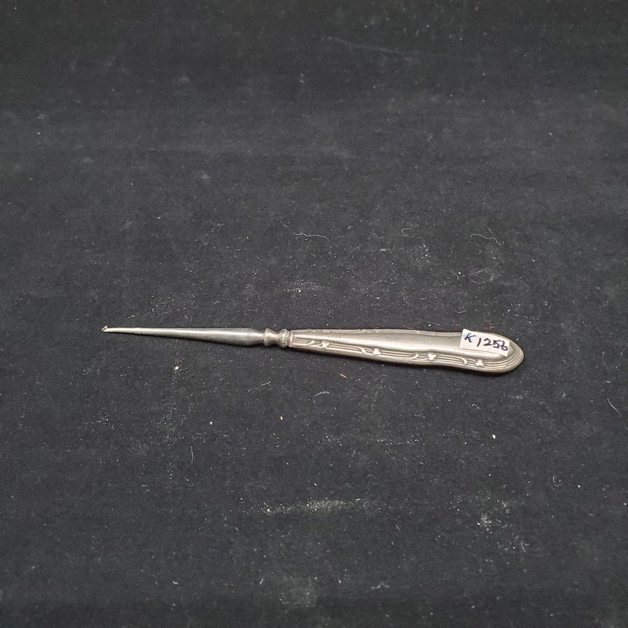 Steel crochet hook with sterling silver handle. English hall marks for Birmingham 1920 Design around outside edges of handle - lines with flower and leaf stems.