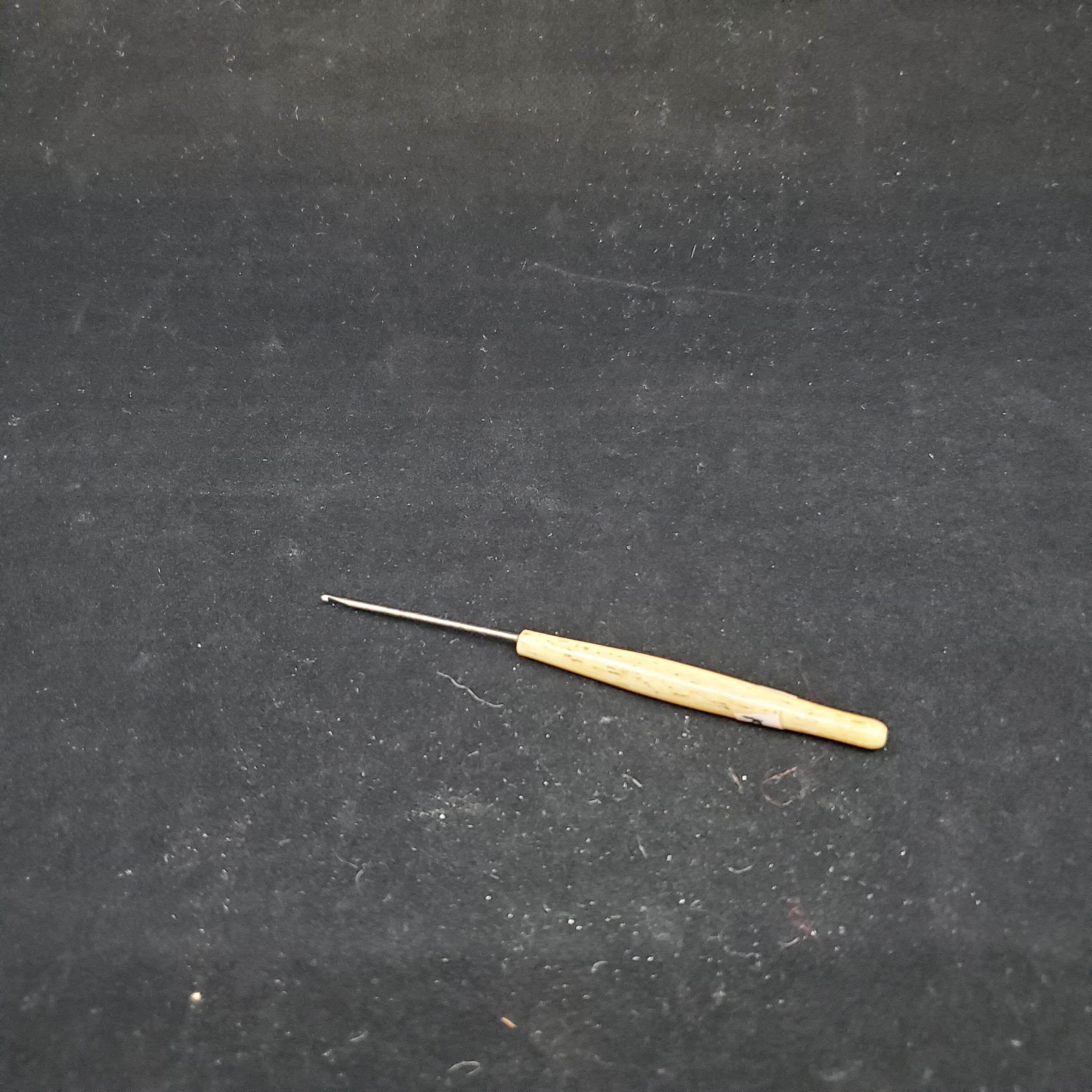Very fine steel crochet hook with a bone handle. Handle a creamy colour with dark brown markings. Slightly rounded through center area.