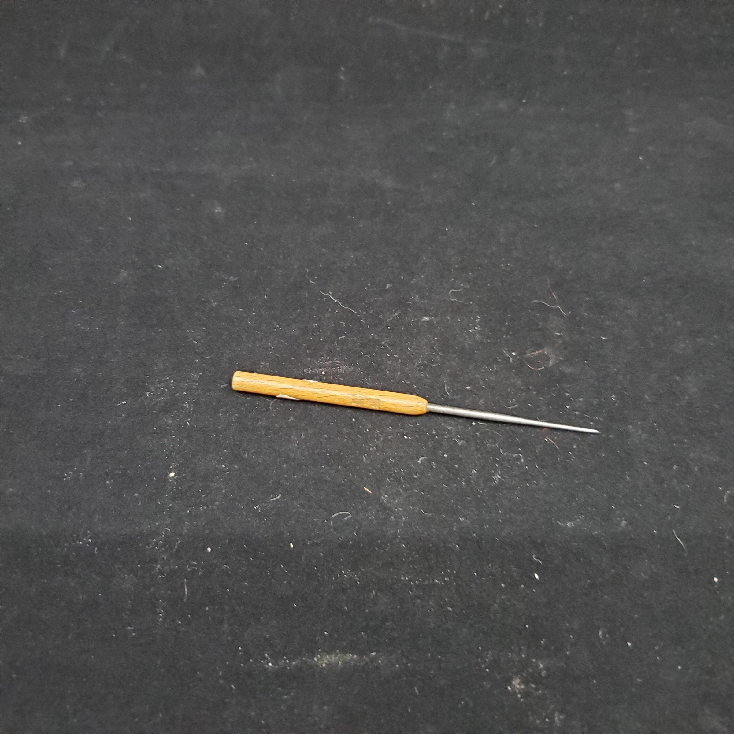 Crochet hook, steel, with extreme;y fine hook. Wooden - light brown coloured - tubular - handle. No 11 stamped in handle.