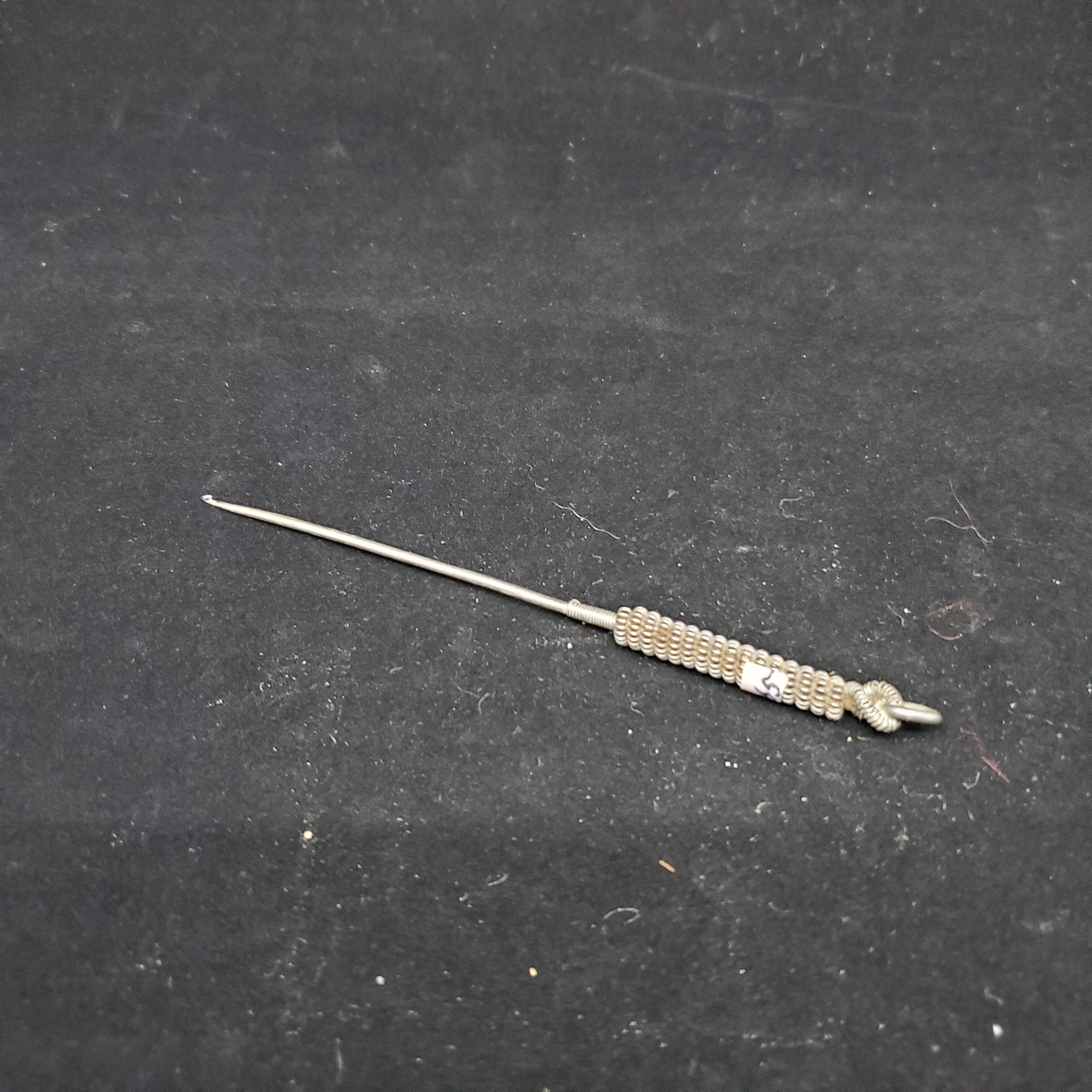 Steel crochet hook with wound wire handle.Ring at top. Handle -1 1/2Ó appeasrs to be made of coiled wire. Very fine hook. No size or marks.