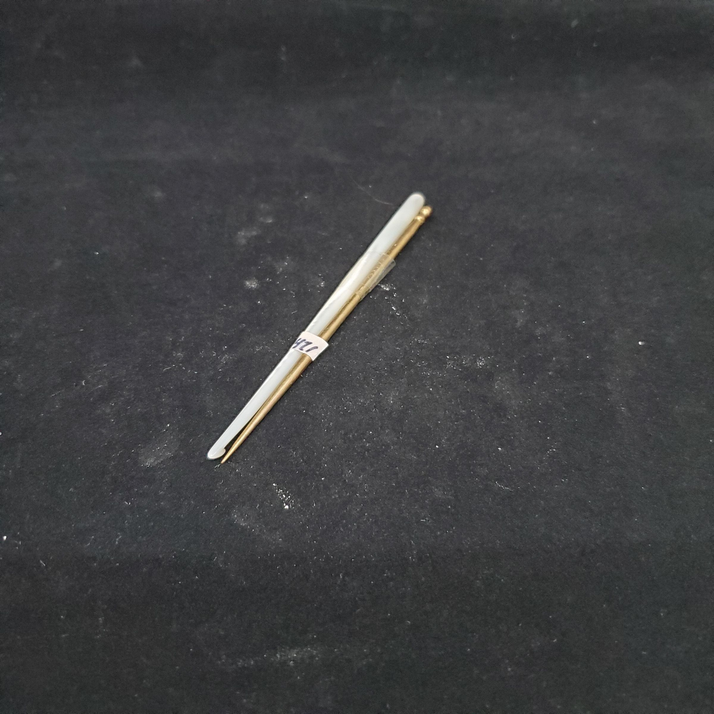 2 crochet hooks.1) Brass with line and scroll pattern in middle area. 2 knobs at top. Fine hook. No marks. 2) Mother of Pearl - Hook at one end.No marks.