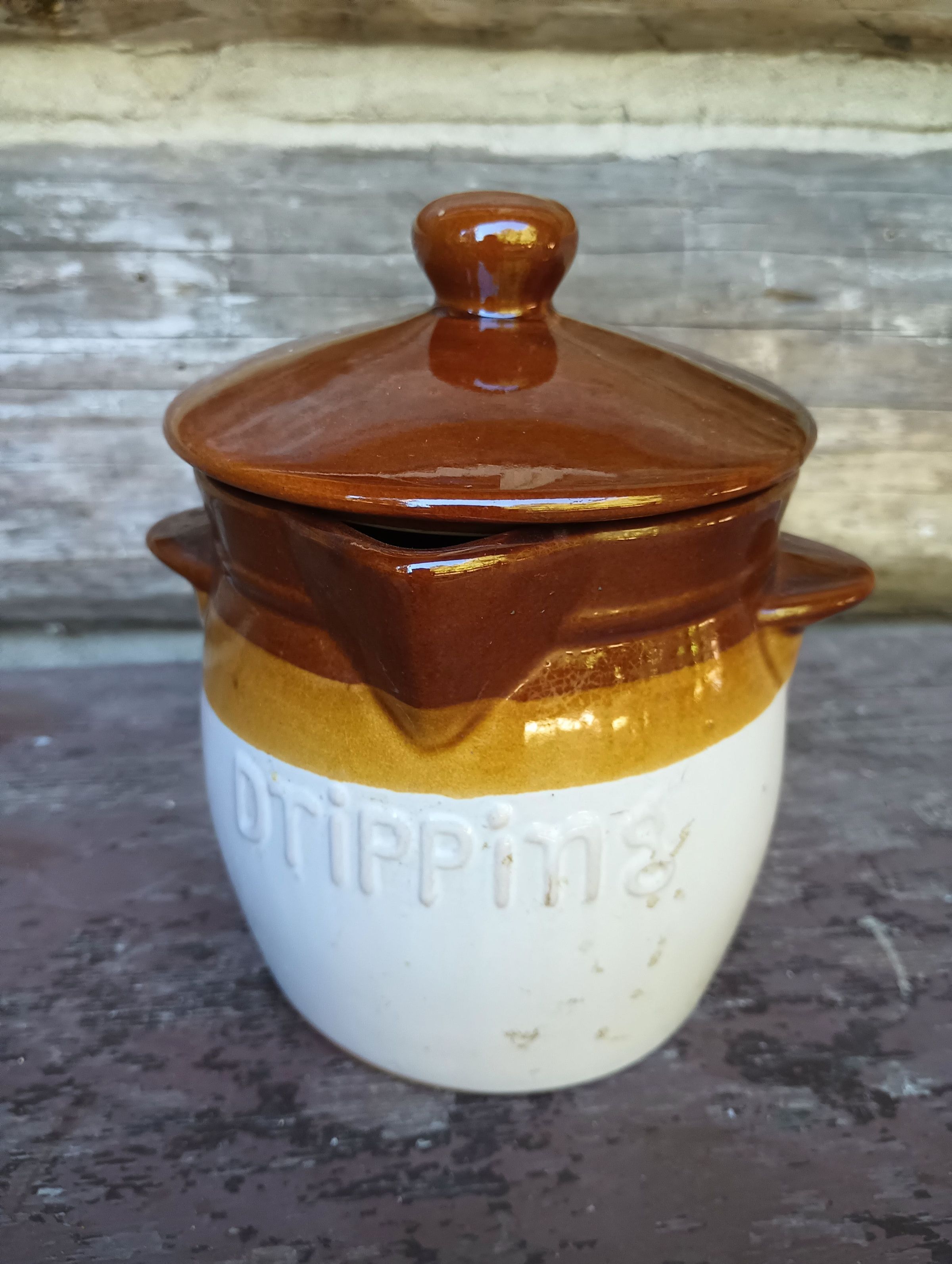Glazed tricolour stoneware crock with lid. 'Dripping' in raised printing on the side.