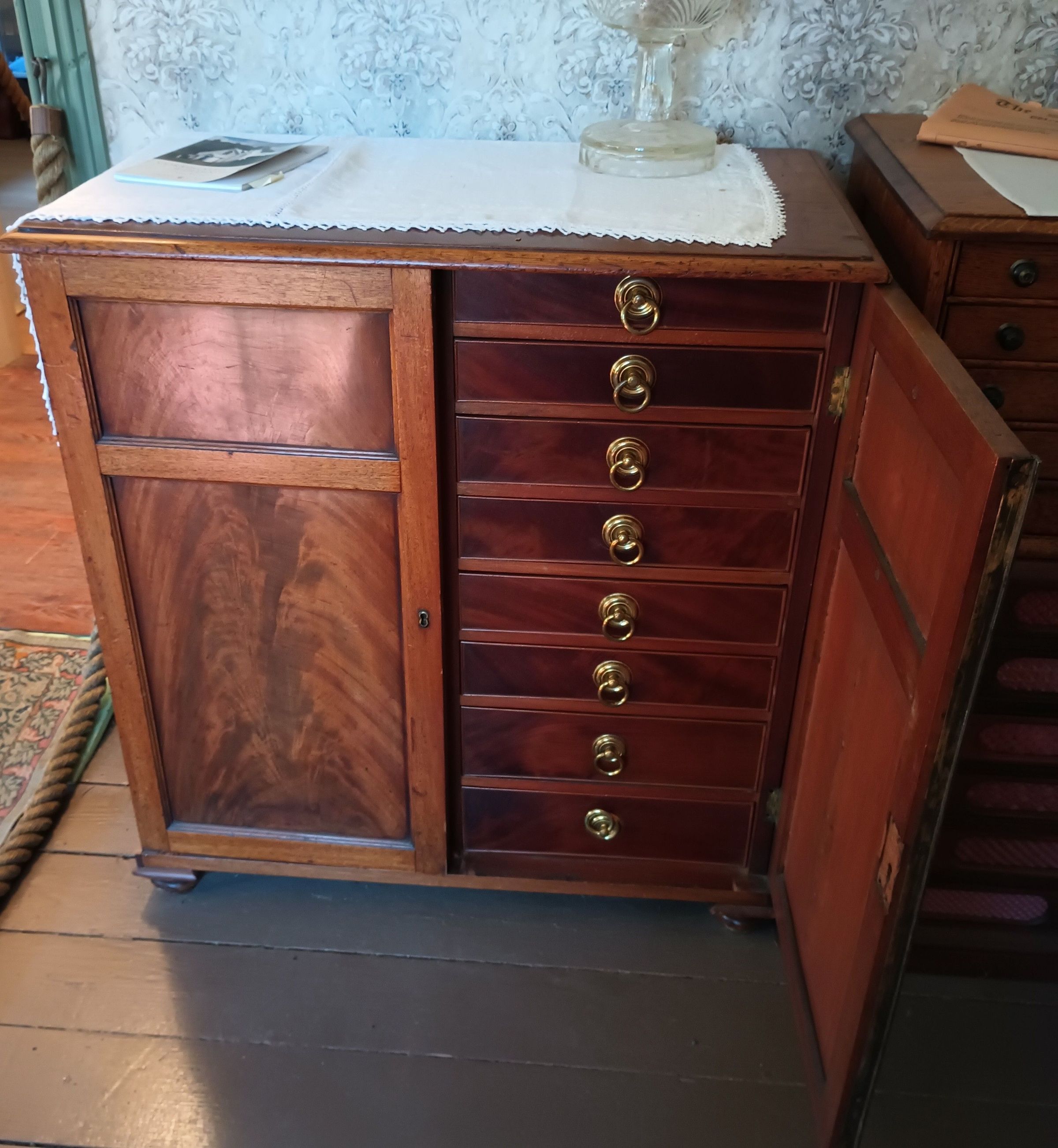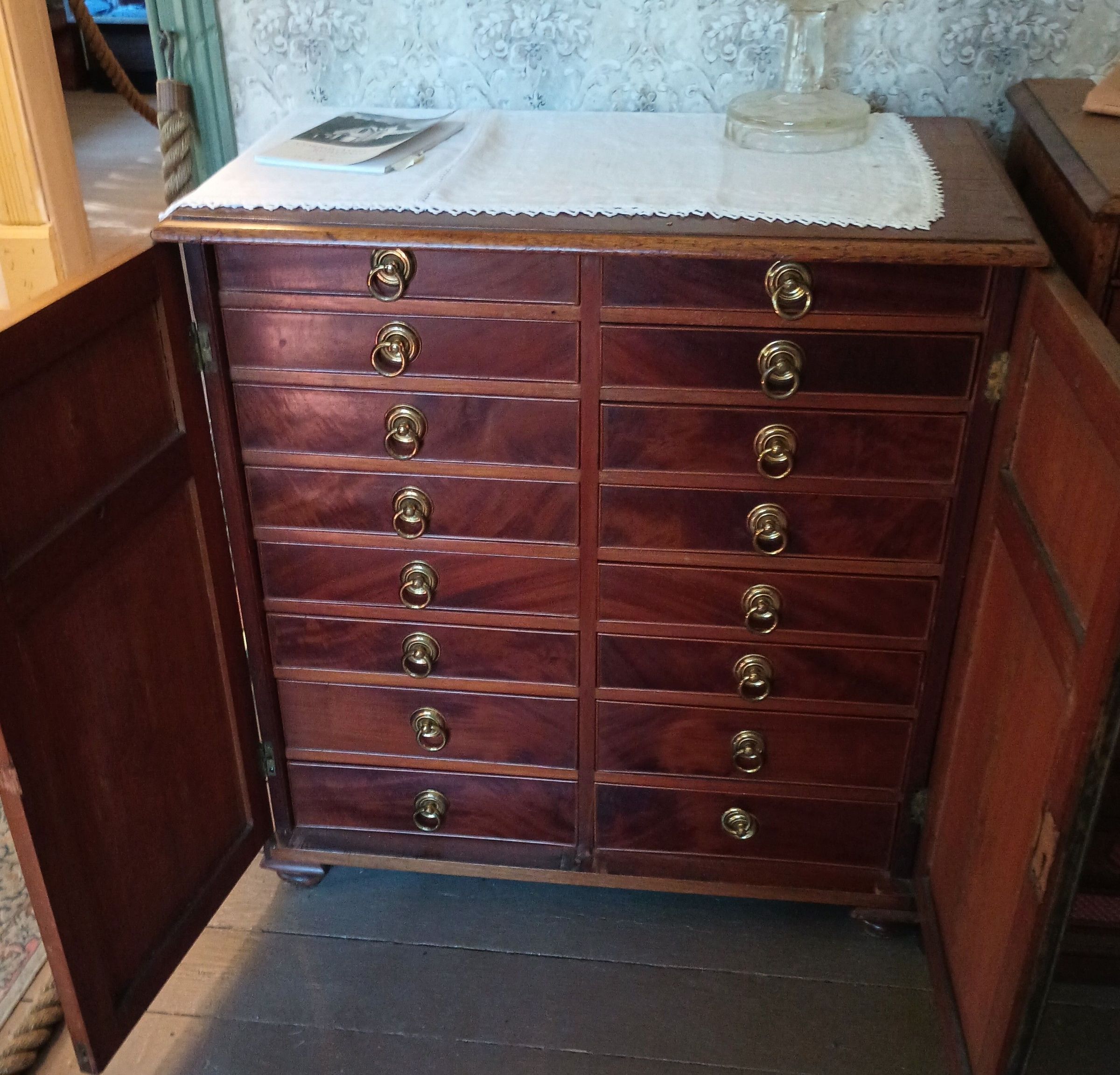 Mahogany cabinet with 16 drawers. Used for thimble collection.