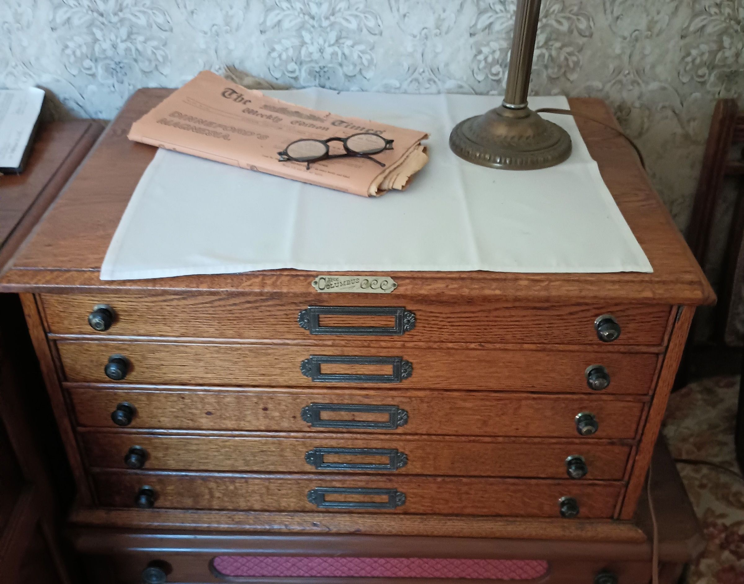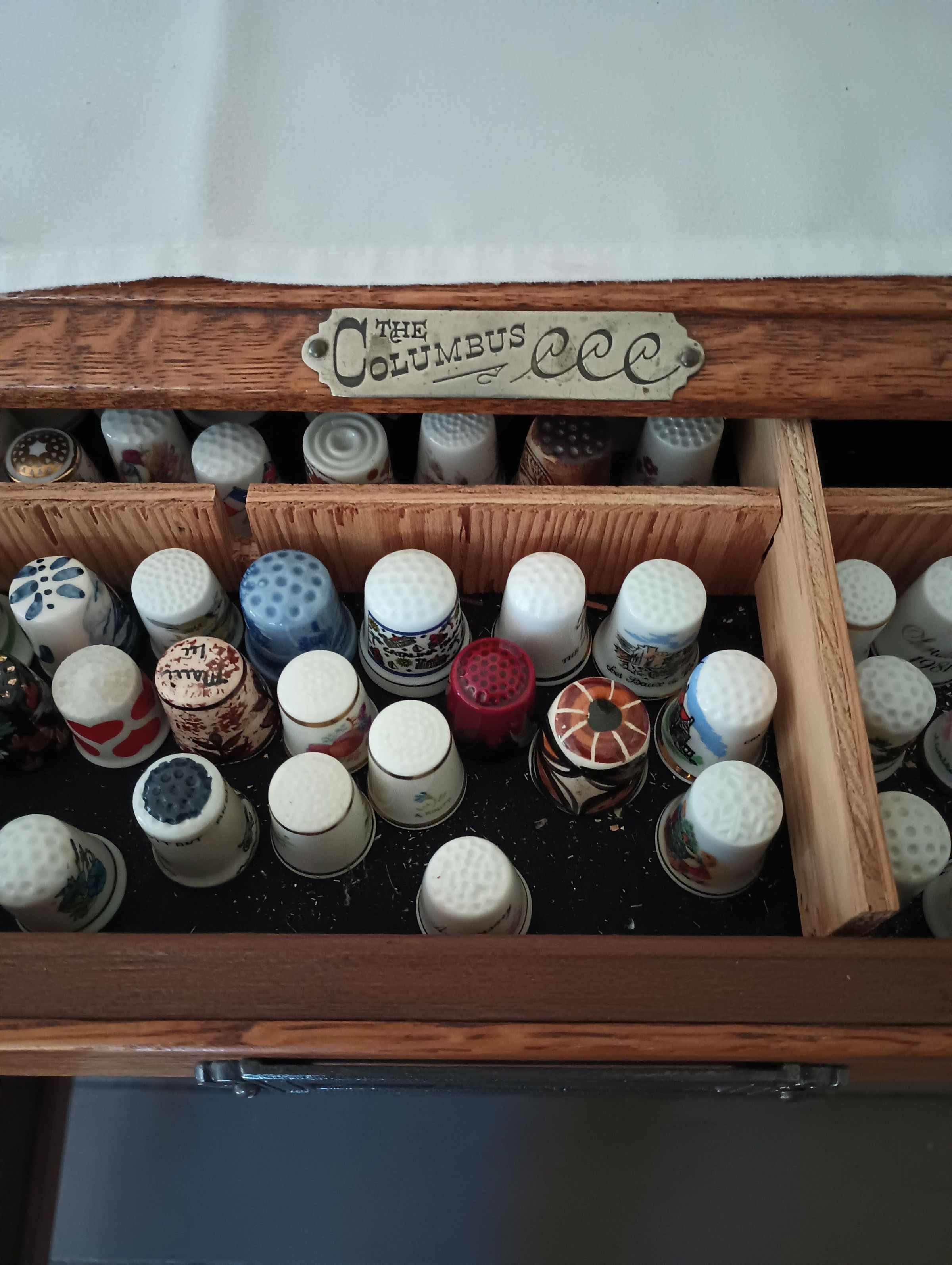 Oak cabinet with 5 shallow drawers. Labeled 'The Columbus'. Used for thimble collection.