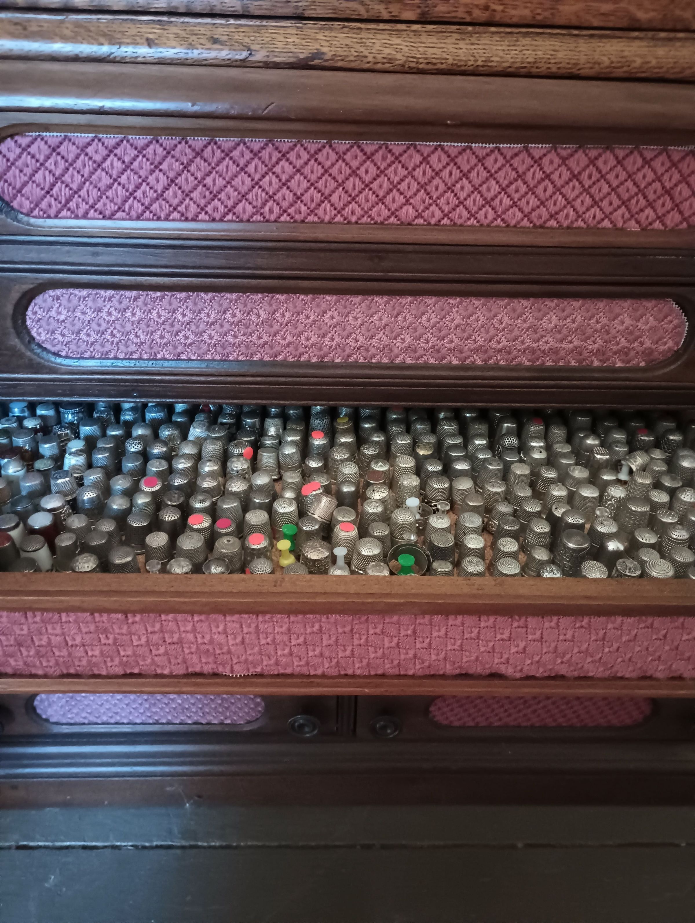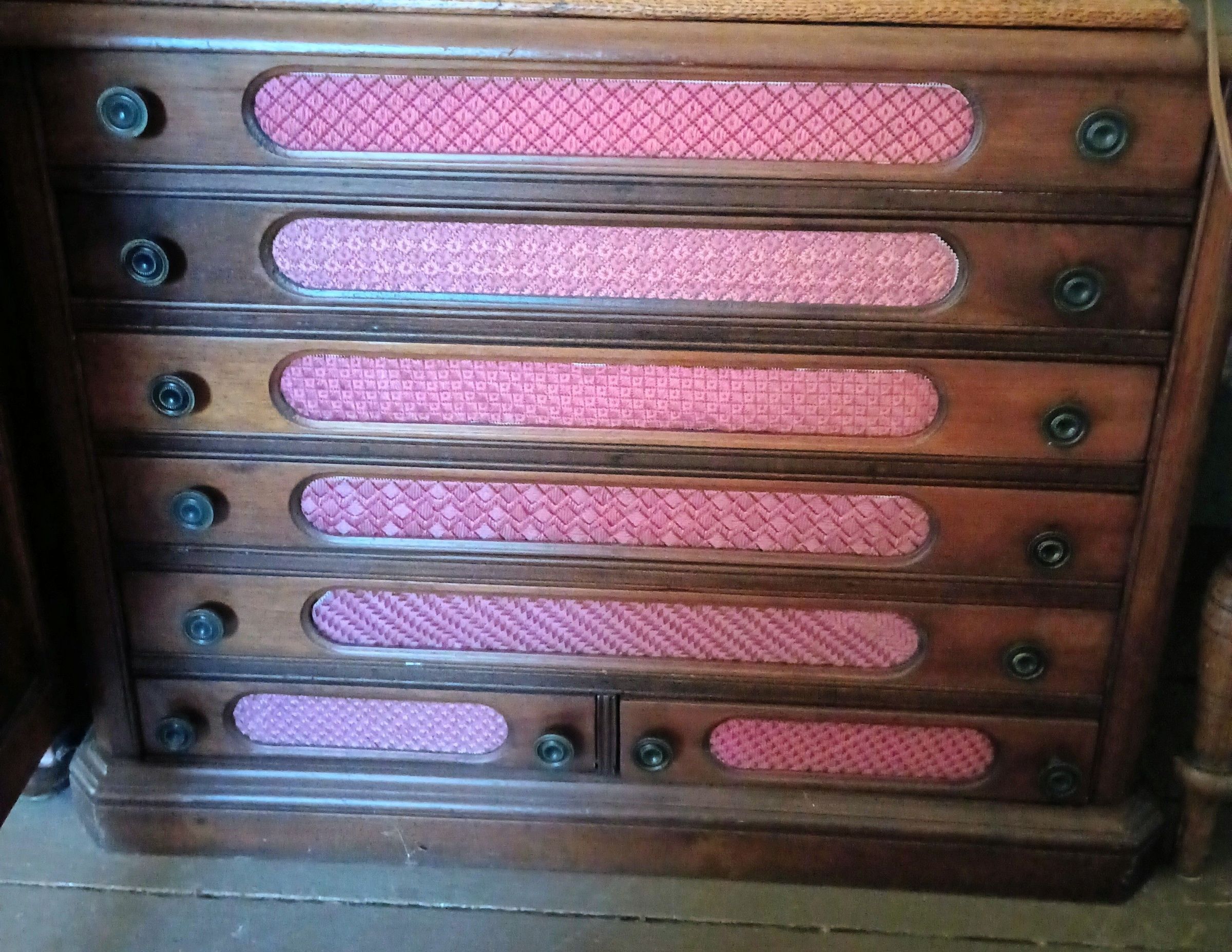 Oak cabinet with 7 shallow drawers. Decorative fabric insets on drawer fronts. Used for thimble collection.