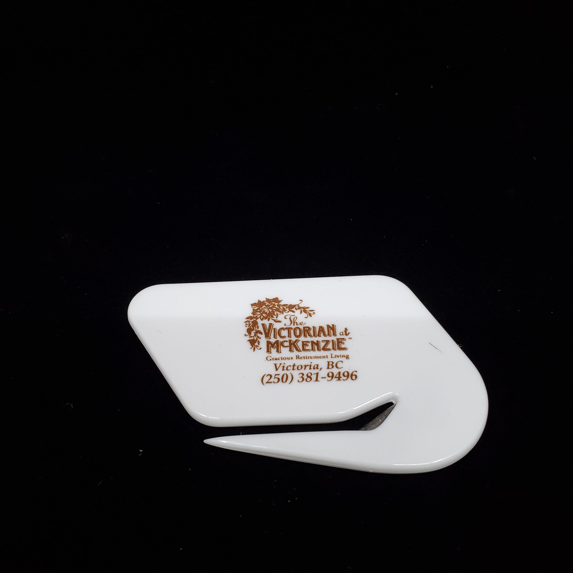 White plastic with open slot with cutting blade. Advertising in brown ÒThe Victorian at McKenzie Gracious Retiremnt Livingf Victoria, B.C. 250-381-9496Ó