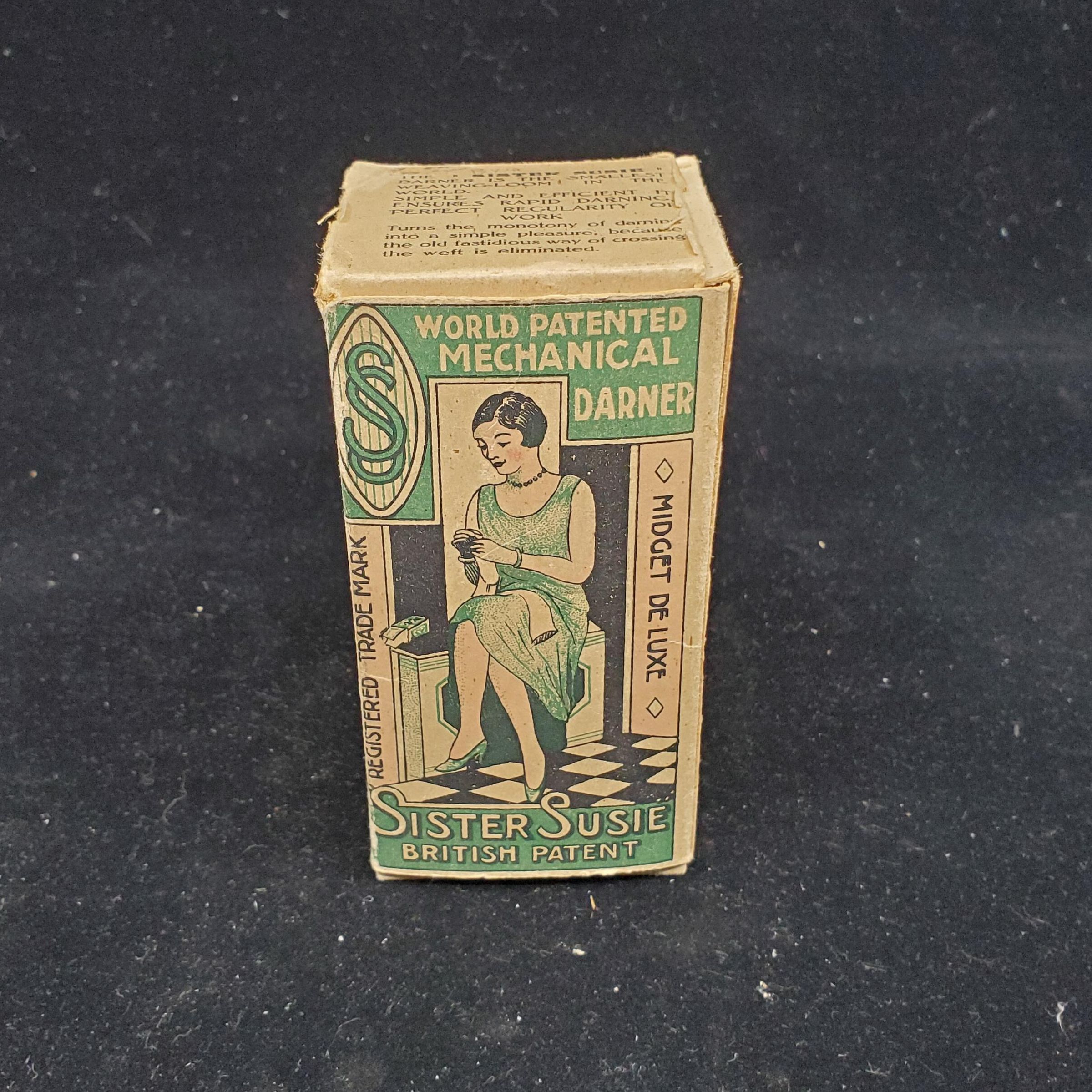 Mechanical darner called ÒSister SusieÕ Green bakelite. In original box. Made in Belgium. Stamped on device ÒWorld Patented Mechancal DarnerÓ Instructions for use cover 3 sides of box.. Called the smallest weaving loom in the world on box.