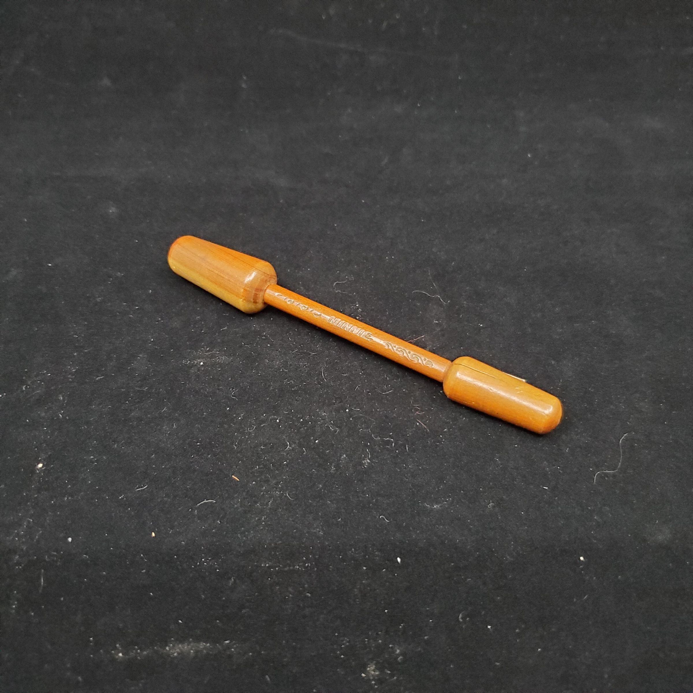 Wooden glove darner. Light to medium brown in colour. one small end and one large end, both removable. On center long rod the name ÒMinnieÓ has been carved with design before and after it.