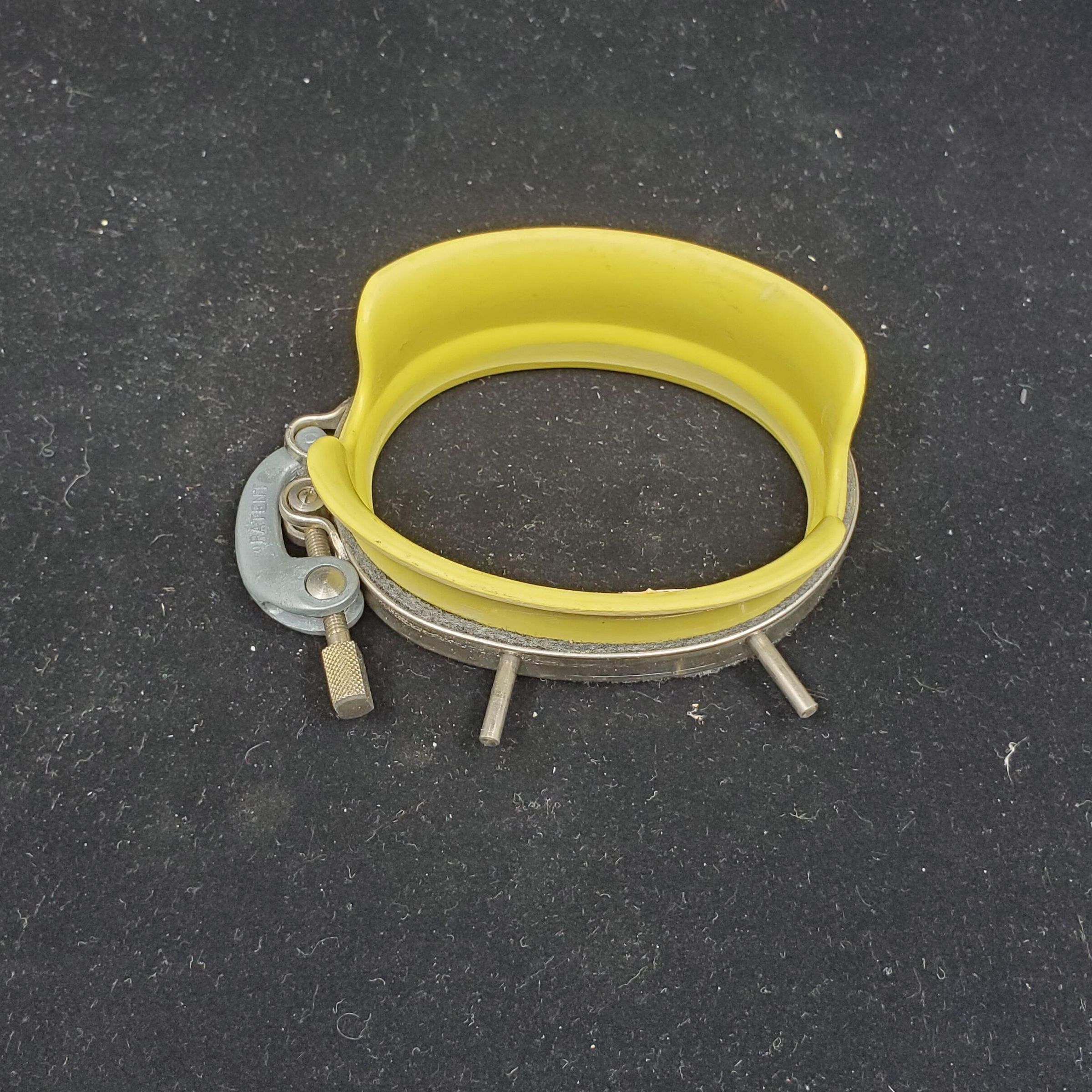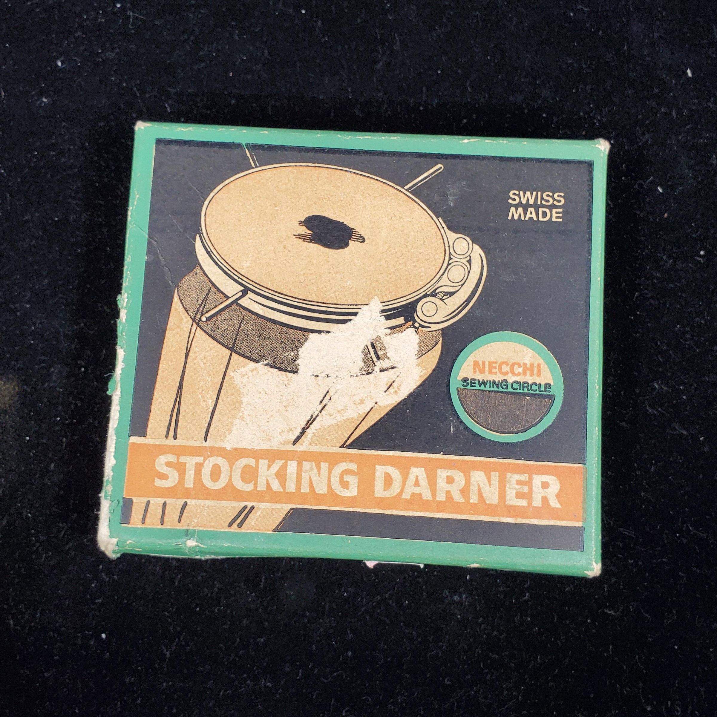 Stocking darner. Original box. Necchi Swiss Made. Yellow plastic oval shaped holder with metal cloth holder near top Metal holder stamped WEBE. Directions for use in box. Box ,cardboard worn.