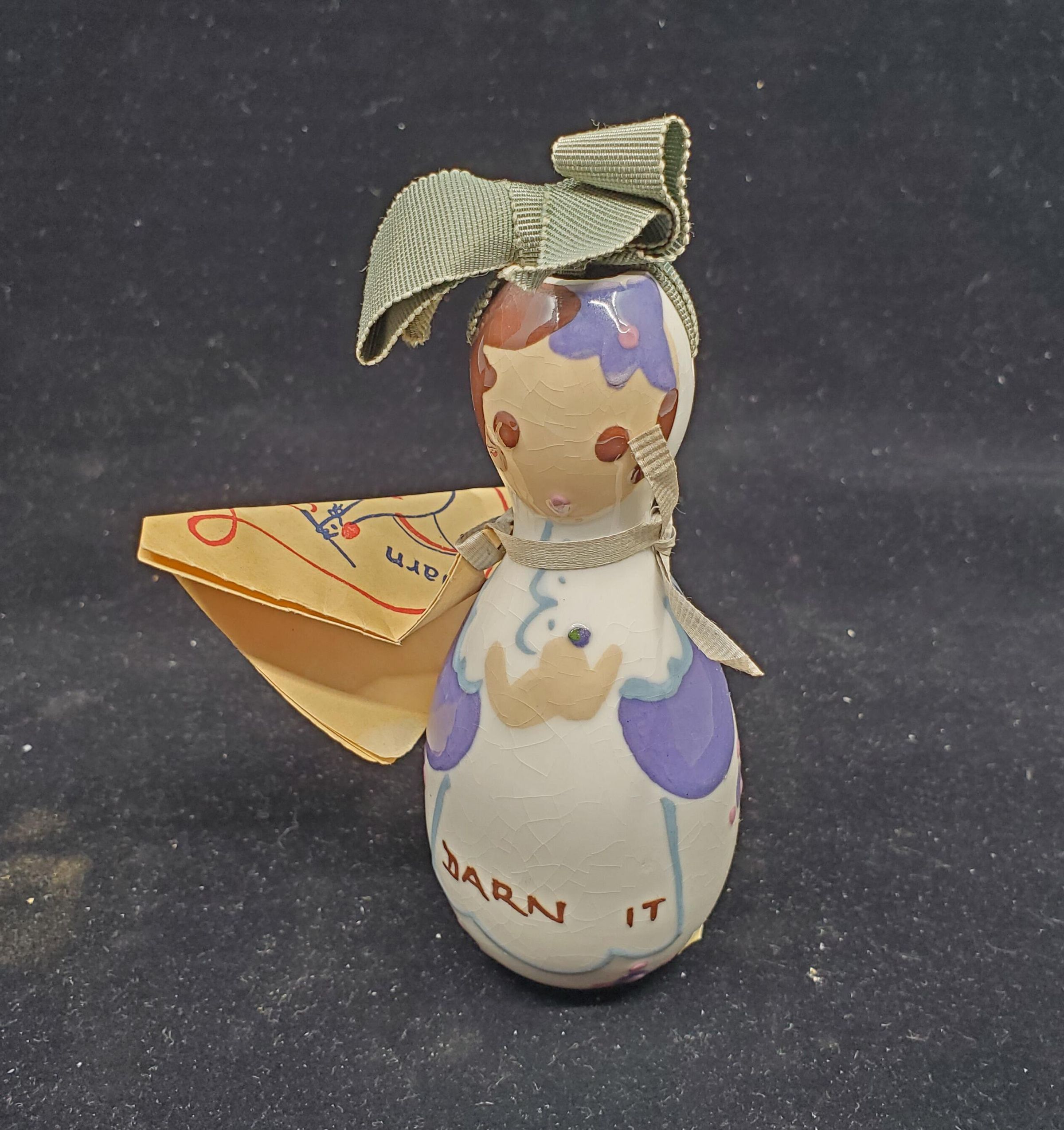 Ceramic darner, glazed, in form of woman, painted face, apron, dress, feet underneath. Green ribbon bow n top.Attached Card ÒDarn ItÓ urging as a WW2 measure to use the ÒDarning DodoÓ to make do, American.